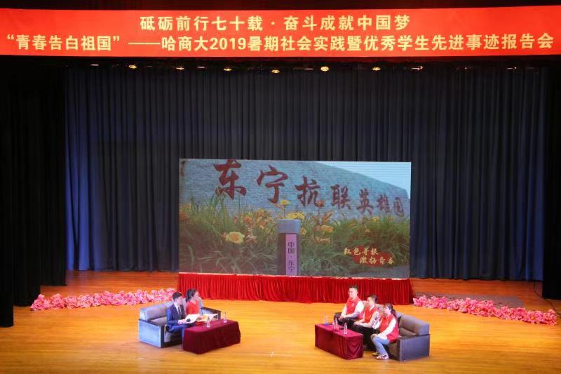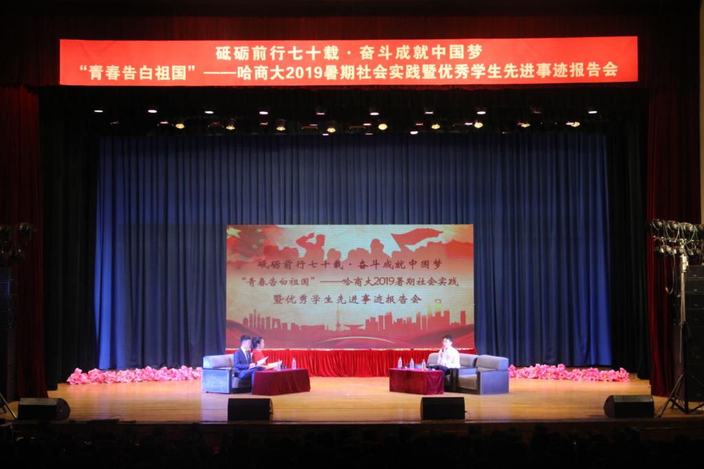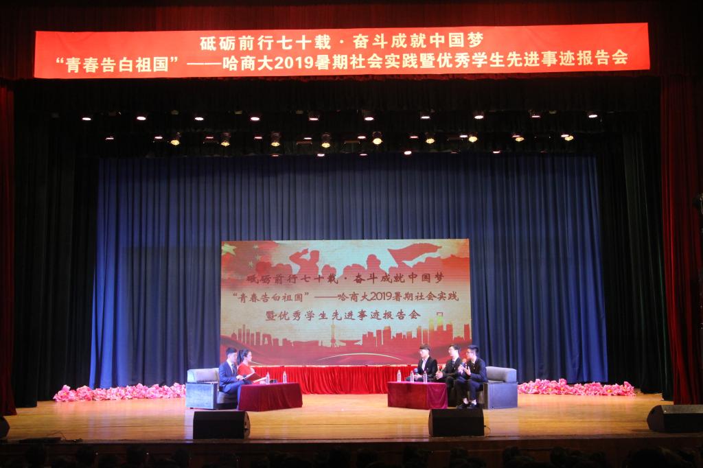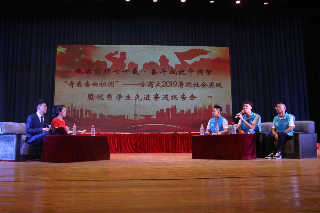 暑假期间,我校共有281支重点项目团队,围绕7项重点实践内容及3项专项实践内容,如火如荼地开展社会实践活动,足迹遍布全国20余个省区市。他们把青春激情和活力集聚为深入基层、深入实践的正能量,在社会实践的广阔舞台上接受锻炼、经受考验、收获真知。本次报告会选取了“青马工程”学生骨干“我和我的祖国——红色寻根·激扬青春”暑期社会实践团队;不忘初心、用爱心温暖留守儿童的“大手拉小手”情暖童心志愿服务团队;伸援助之手、献诚挚爱心、捍法律尊严的哈商大法援工作部等三支实践团队,作为代表深入分享了实践过程及感受收获,生动再现了他们用镜头和纸笔记录国情和社会、用知识和才情服务基层和民生的青春故事。同时,为进一步发挥我校培育、选树的各类学生先进典型的引领示范和辐射带动作用,报告会还邀请了英才学院2016级学生王钰超、英才学院2016级制药工程1班、“挑战杯”省赛一等奖“一触即发”——面向人手的智能物联系统团队作为优秀学生和先进集体代表,分别围绕专业学习、创新创业、考研就业、志愿服务及日常生活等方面,与现场学生分享了各自的成长经历、学习方法、奋斗历程、人生目标及青春感悟,并对学弟学妹们的大学生活提出了合理的意见和建议,鼓励大家敢于有梦、勇于追梦。