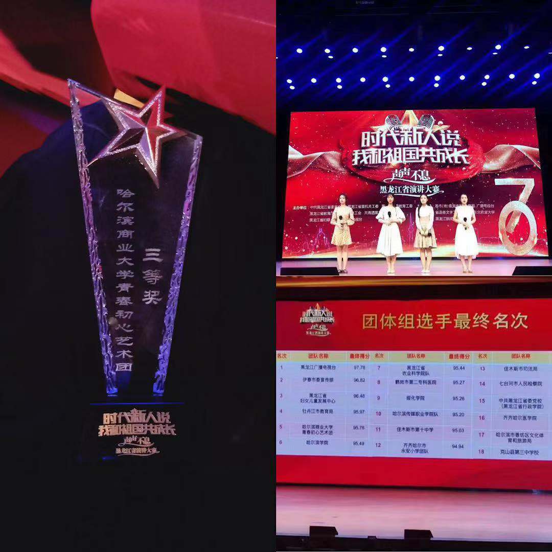 为庆祝新中国成立70周年,充分展现70年来的深刻变化和龙江大地的蓬勃发展,生动讲述普通群众与共和国同成长、共命运的动人故事,黑龙江省委宣传部联合黑龙江省直机关工委、黑龙江省委教育工委、黑龙江省教育厅、黑龙江省总工会、共青团黑龙江省委员会、黑龙江省妇联、黑龙江广播电视台在全省范围内组织开展了“时代新人说——我和祖国共成长”声声不息黑龙江省演讲大赛。经过省直机关、十三市地、省内各高等院校及中学的层层选拔,近万名选手的激烈角逐,由我校团委选送的基础科学学院“青春初心”艺术团创作表演的演讲作品《青春·在路上》脱颖而出,以出色的表现斩获全省决赛三等奖,取得团体类全省第五名,高校组第一名的优异成绩。