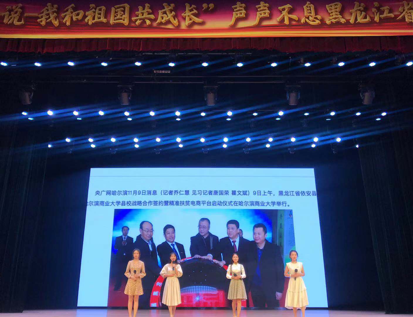 《青春·在路上》以我校与齐齐哈尔依安县建立战略合作、开展精准扶贫工作为叙事背景,参赛选手王丽达、卢盛泽、刘悉奥、李新田四名同学声情并茂地讲述了我校青年志愿者深入依安县20余个村屯开展“大手拉小手”情暖童心关爱留守儿童志愿服务活动及我校师生为依安县搭建精准扶贫电商平台,助力龙江全面振兴、全方位振兴的感人故事和先进事迹,集中展现了新时期商大青年扎根龙江,服务龙江,助力龙江高质量发展的初心使命与责任担当。《青春·在路上》引发了大赛评委以及现场观众的强烈共鸣,比赛也通过黑龙江新闻广播及龙视新媒体客户端进行了全程直播,引发社会广泛关注。