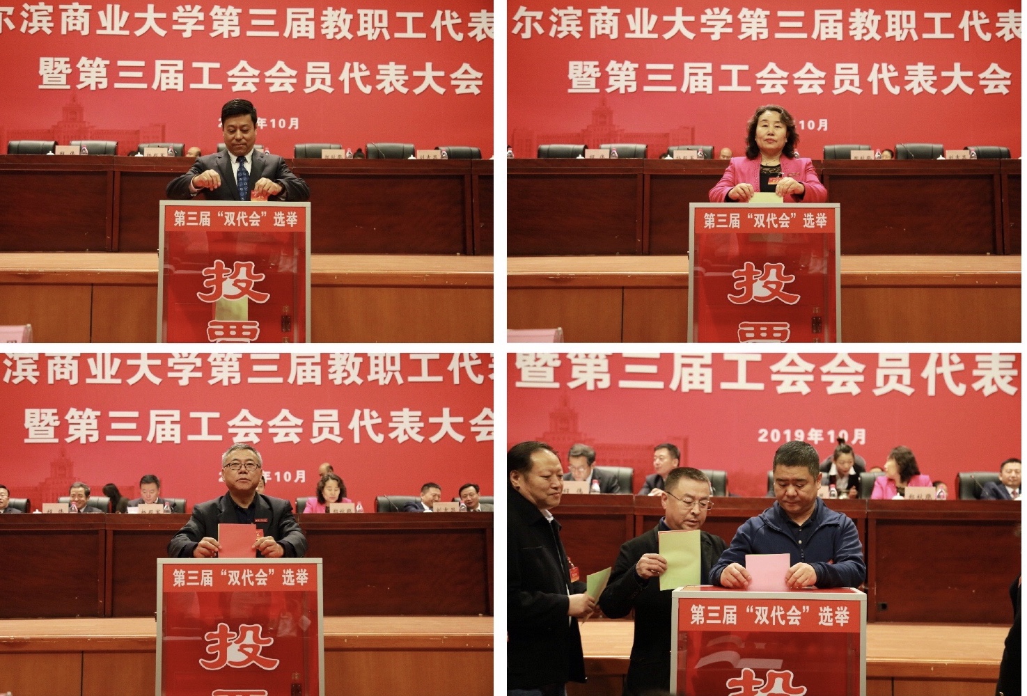14:00,在哈尔滨商业大学第三届教职工代表大会暨第三届工会会员代表大会第二次全体会议上,通过《大会选举办法》和大会总监票人、监票人名单。选举第三届教代会执行委员会委员、第三届工会委员会委员和第三届工会经费审查委员会委员。