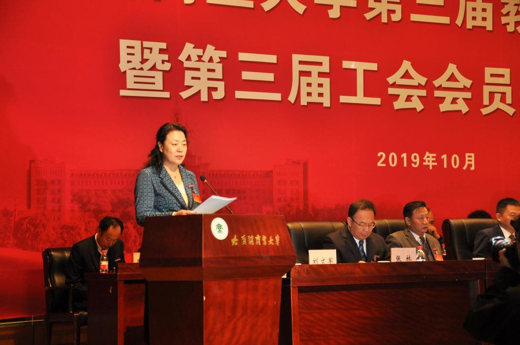 校工会主席李晓梅以《不忘初心 牢记使命 接续奋斗不断开创新时代教代会、工会工作新局面》为题作工会工作报告。报告全面回顾了第二届教职工代表大会暨第二届工会会员代表大会召开至今的主要工作开展情况,全体会员紧紧围绕学校中心工作,不忘初心、牢记使命,积极推进学校民主政治建设、维护教职工合法权益、师德师风建设和校园文化建设等工作,一是坚持强化理论武装,把牢工会工作政治方向;二是牢记初心使命,民主政治建设不断取得新进展;三是坚持立德树人,不断提高“三育人”工作水平;四是履职尽责担当,竭诚为教职工服务;五是开展丰富多彩的文体活动 ,丰富校园文化生活;六是加强教代会、工会建设,进一步提高履职能力和水平;七是立足服务龙江,努力完成省委省政府安排的帮扶解困和精准扶贫任务。