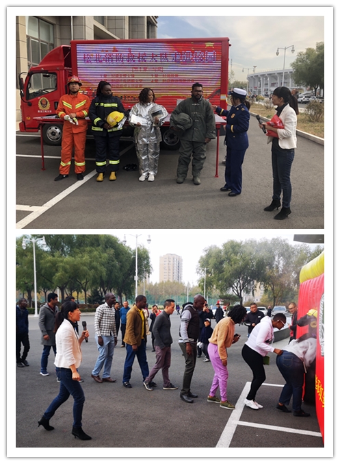 随后,所有留学生们参加了消防演习,留学生们按照动作要领和安全标识的指引有序地从逃生疏散演练屋模拟逃生,部分留学生还亲自穿上的防火服、隔热服及救援服体验。