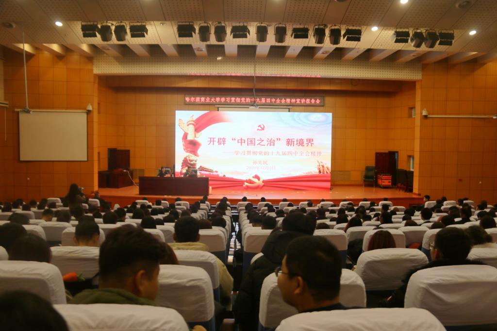 12月3日晚,我校在国际报告厅举办学习贯彻党的十九届四中全会精神宣讲报告会。学校党的十九届四中全会精神宣讲团团长、校党委书记孙先民以《开辟“中国之治”新境界——学习贯彻党的十九届四中全会精神》为题作宣讲报告。来自校院两级学生骨干及青马工程骨干学员参加报告会。