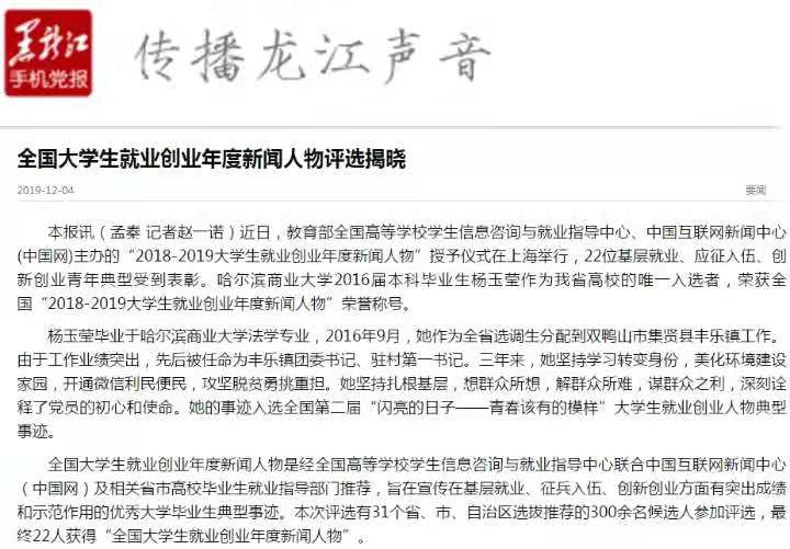 近日,教育部全国高等学校学生信息咨询与就业指导中心、中国互联网新闻中心(中国网)主办的“2018-2019大学生就业创业年度新闻人物”评选揭晓,本次评选有31个省、市、自治区选拔推荐的300余名候选人参加评选,最终22位基层就业、应征入伍、创新创业青年典型受到表彰。我校2016届本科毕业生杨玉莹荣获全国“2018-2019大学生就业创业年度新闻人物”荣誉称号。