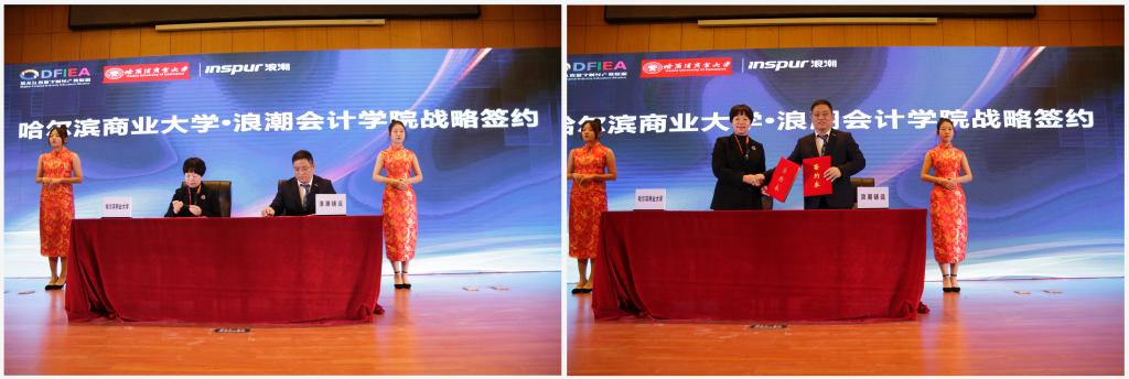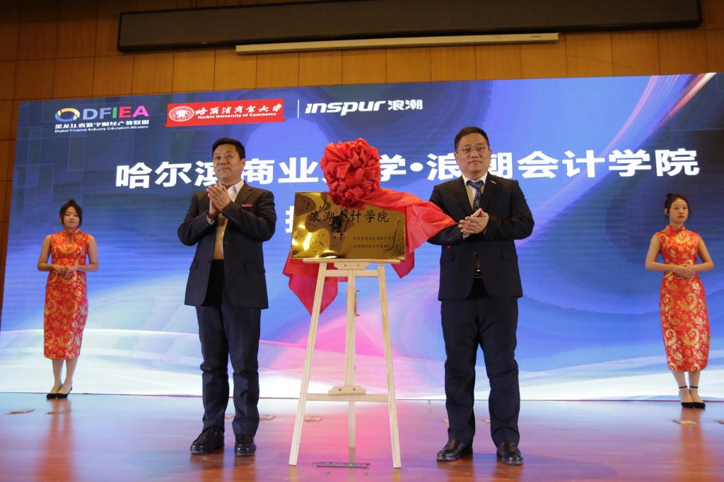 会上,我校与山东浪潮铸远教育科技有限公司签署战略合作协议,成立“哈尔滨商业大学——浪潮会计学院”;马建军总裁与孙先民书记为“哈尔滨商业大学——浪潮会计学院”揭牌。