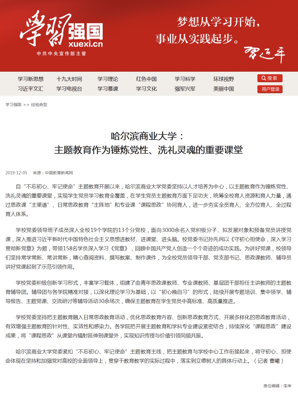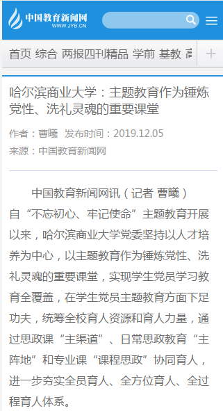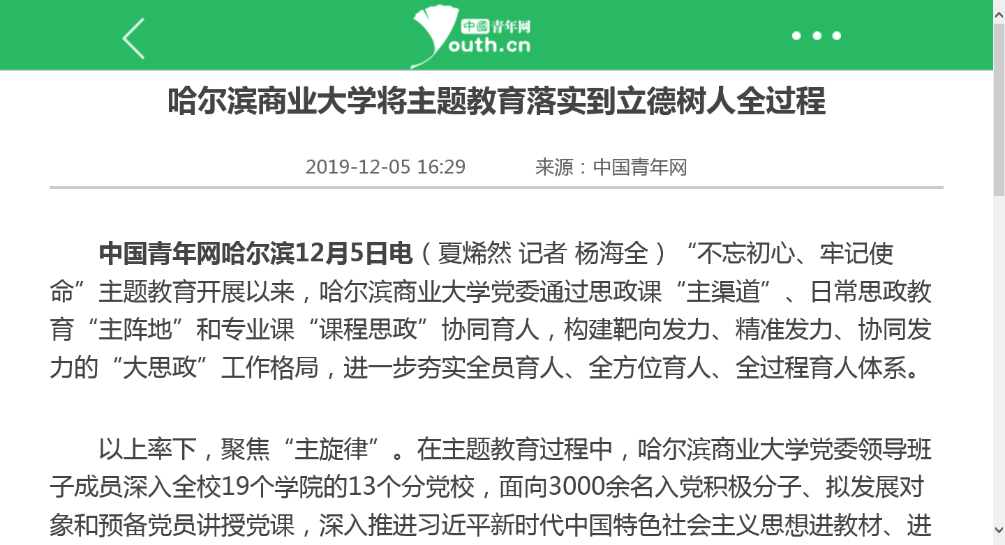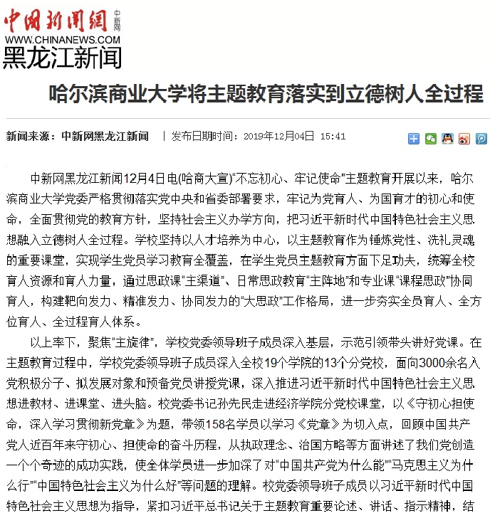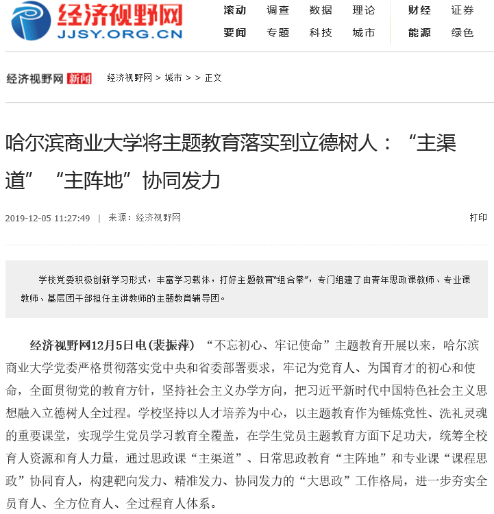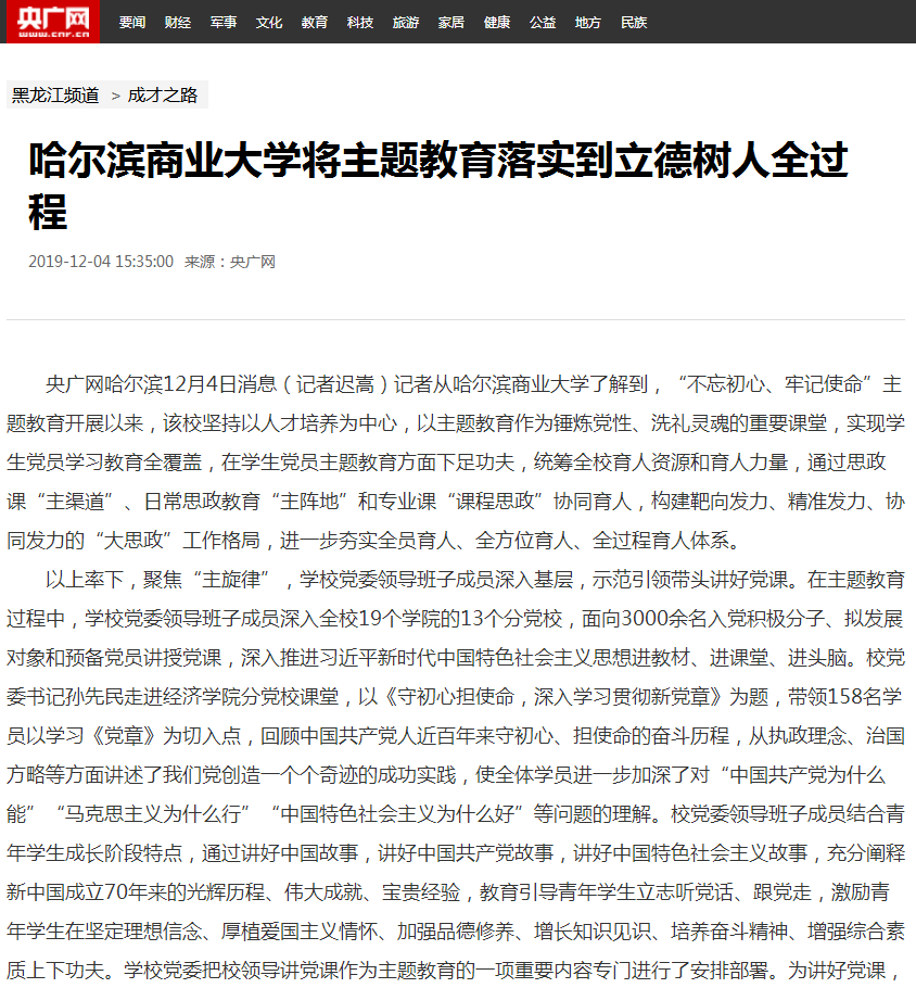 “不忘初心、牢记使命”主题教育开展以来,学校坚持以人才培养为中心,以主题教育作为锤炼党性、洗礼灵魂的重要课堂,实现学生党员学习教育全覆盖,通过思政课“主渠道”、日常思政教育“主阵地”和专业课“课程思政”协同育人,构建靶向发力、精准发力、协同发力的“大思政”工作格局,进一步夯实全员育人、全方位育人、全过程育人体系,受到“学习强国”学习平台、中国新闻网、央广网、中国教育新闻网、中国青年网、改革网、经济视野网等多家媒体广泛关注。