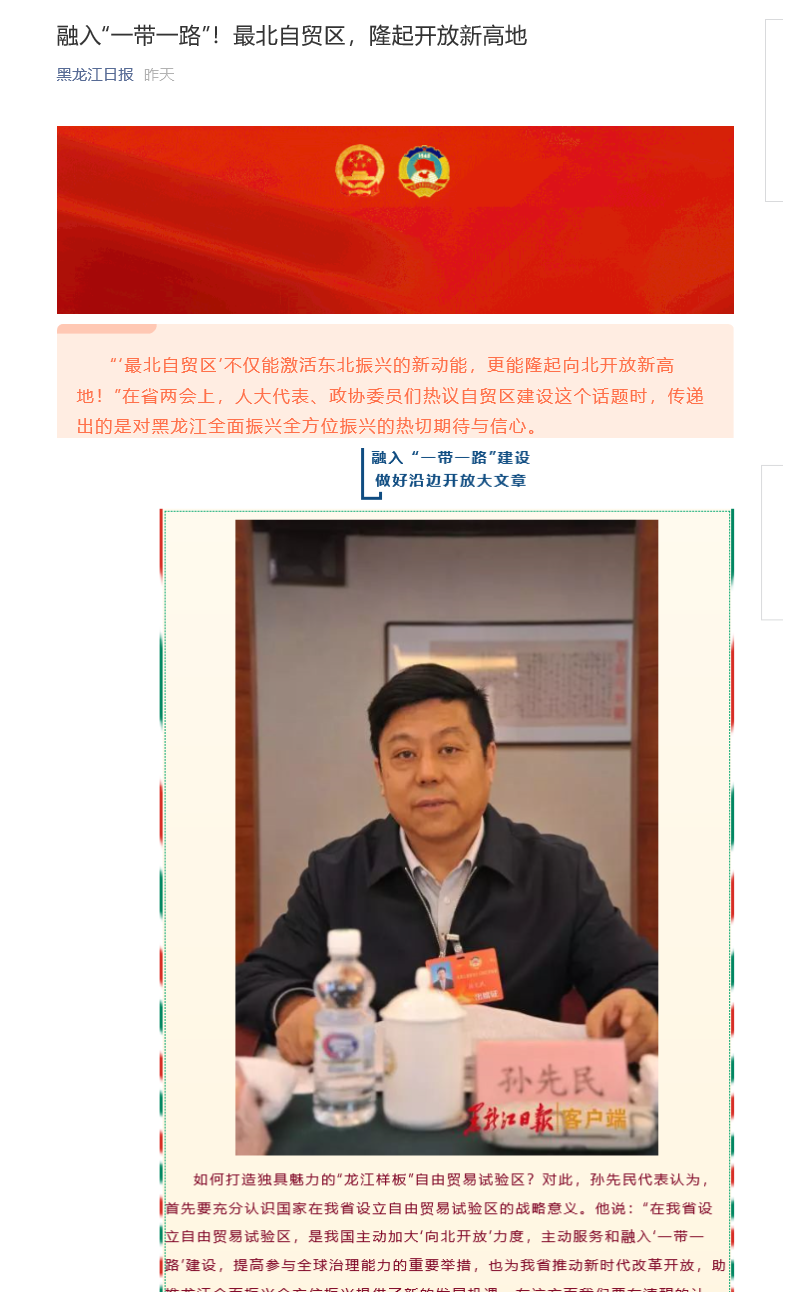 省政协委员孙先民提出“加快自贸试验区对俄开放高地建设,促进我省开放经济高质量发展”的提案