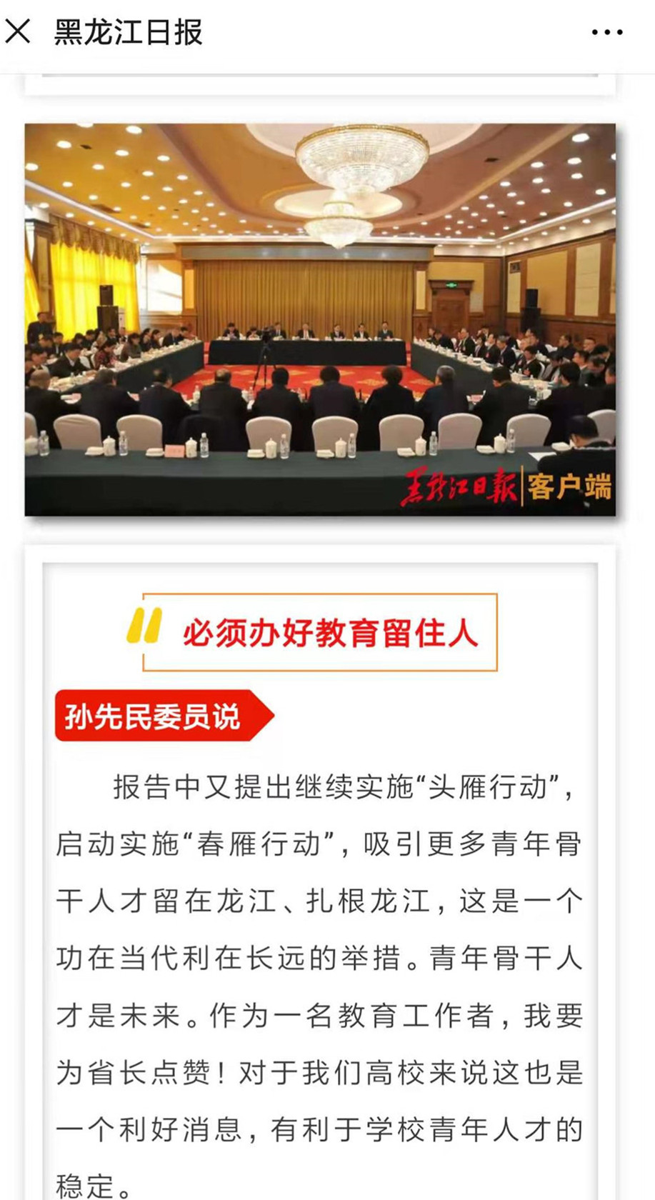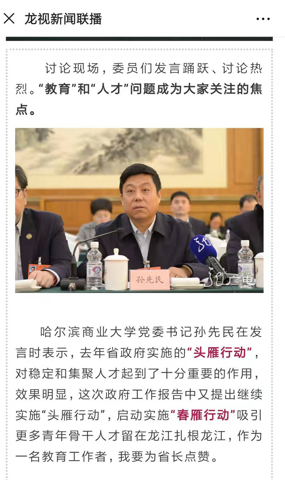 2020年1月12日—16日、1月11日—15日,省十三届人大四次会议、省政协十二届三次会议分别在哈尔滨召开。2020年全省“两会”期间,我校代表委员聚焦政府工作报告中的核心、重点、关键问题,围绕自贸区建设、康养产业、人才引进等涉及经济、人才、教育、民生等重点领域,建言献策、参政议政、积极发声,提出了高质量的建议和提案,受到新闻媒体广泛关注。黑龙江新闻联播、黑龙江日报、中国新闻网、东北网、黑龙江政府网、经济视野网等多家媒体进行了采访和报道,累计宣传报道近20条(次)。