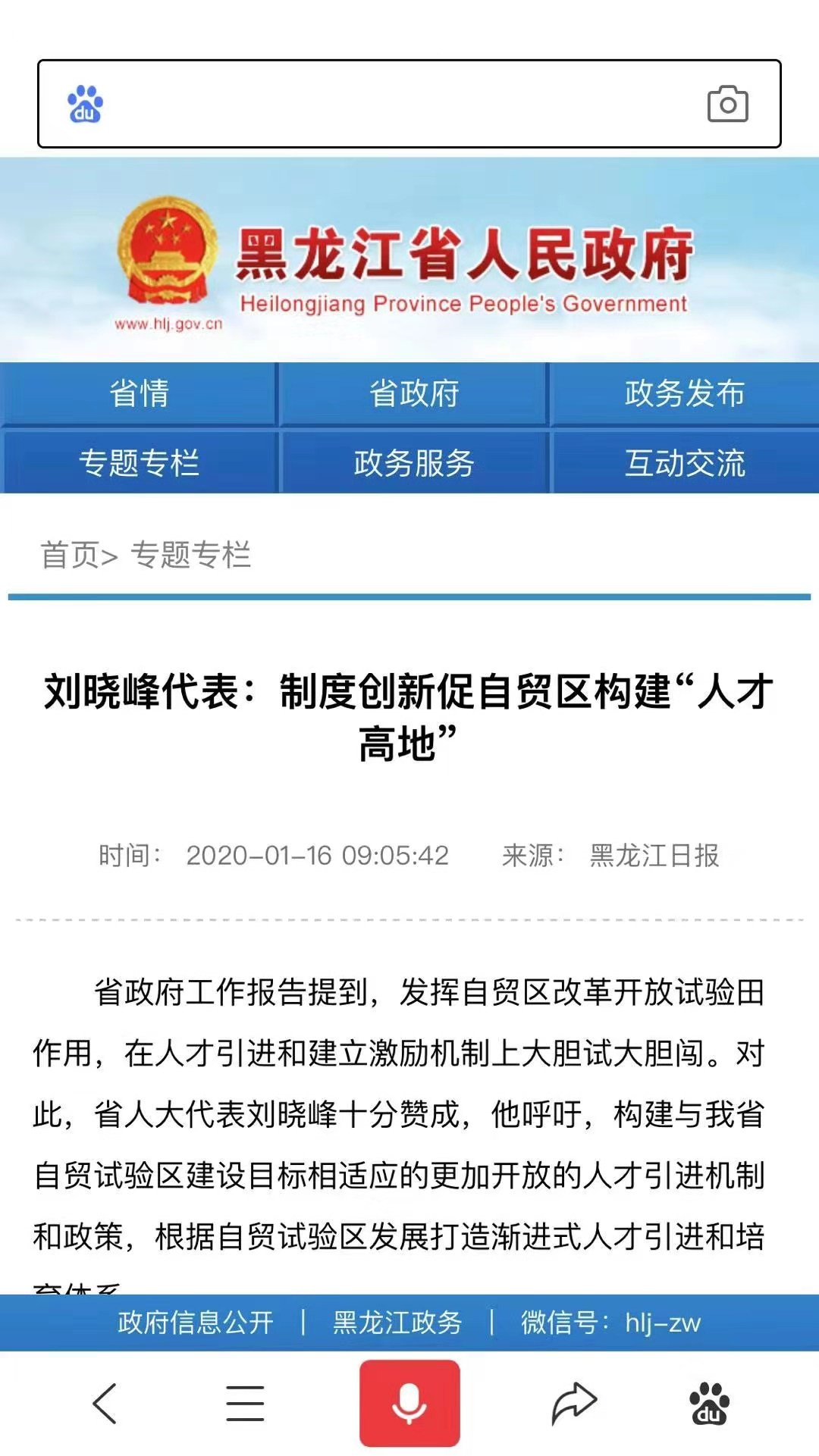 省人大代表刘晓峰提出“以制度创新为突破口,打造黑龙江自由贸易试验区人才高地”的建议