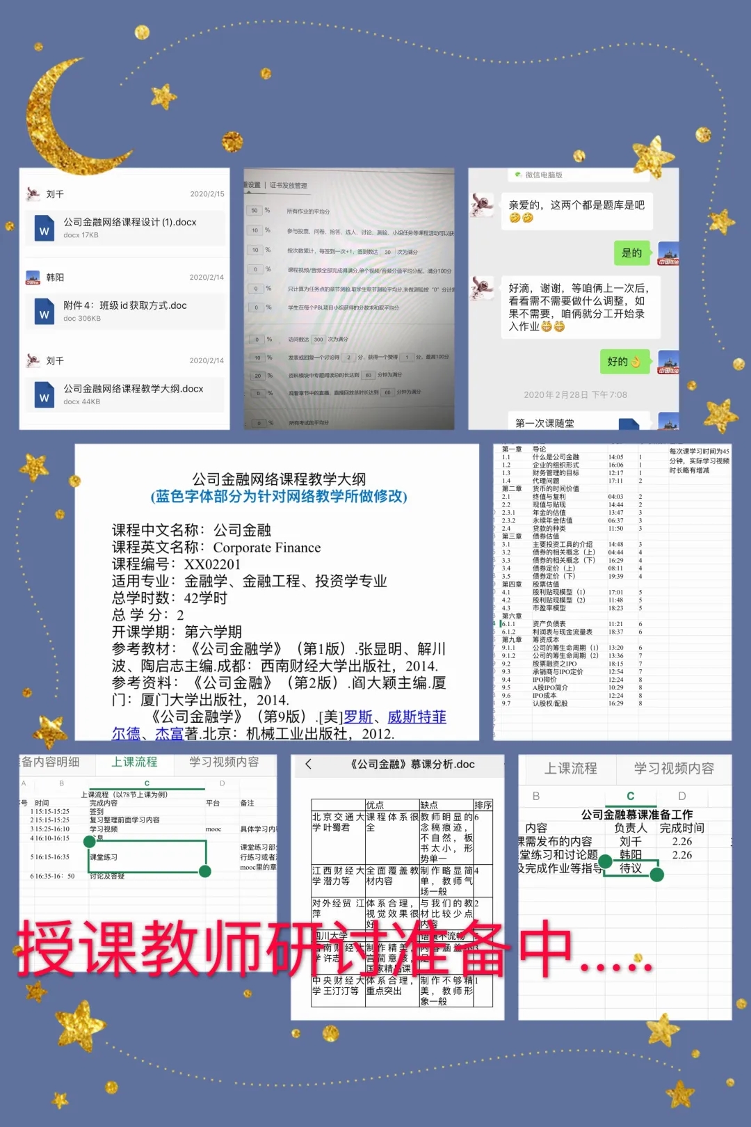 金融学院充分发挥教研室的作用,由教研室教师年轻教师带领,比较各平台优势和劣势,熟悉平台使用规则和方法,确保线上授课取得好的教学效果。投资学教研室刘千老师详尽制定的《公司金融》网课课程大纲和授课计划成为全院老师借鉴的样板。