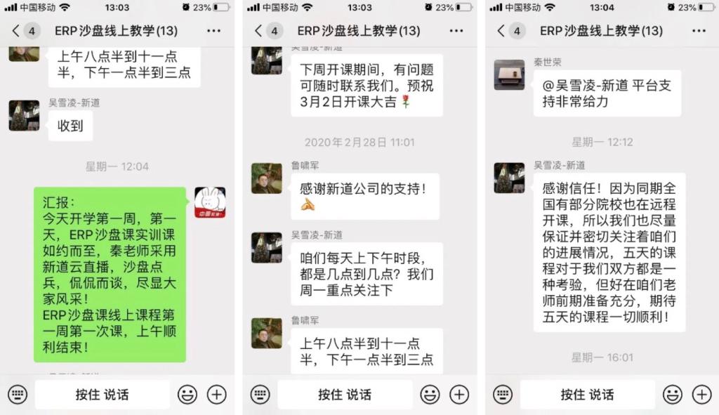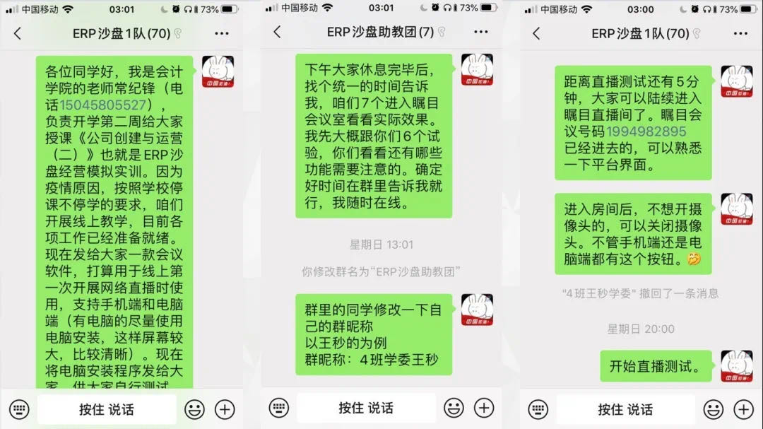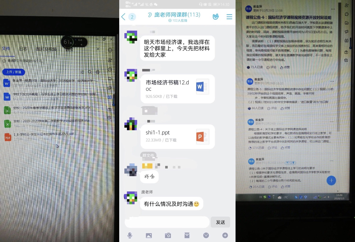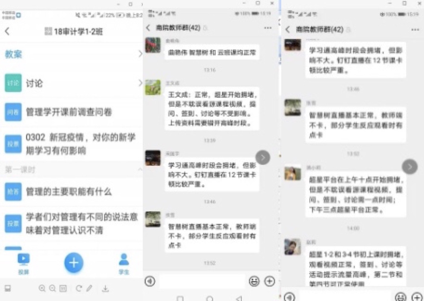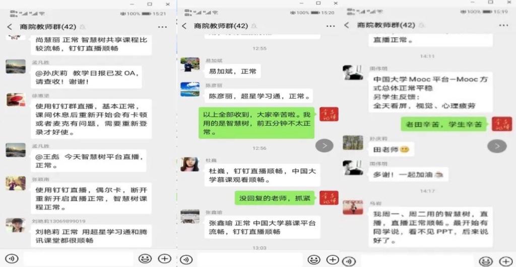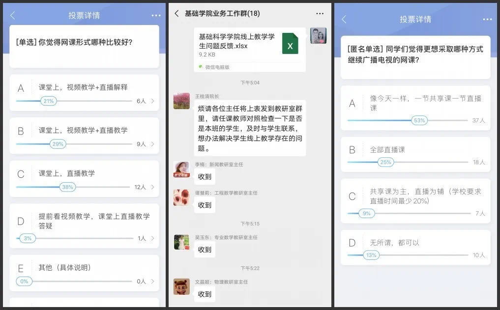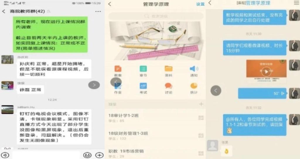 正式开课前,学院再次召开班子网络会议,强调保障网络开课的各个环节。在学院和教研室两级班子及学院督导组参与下,所有任课教师均提前进行了在线测试,学院积极分享推广成功经验。制定学院督导与学院班子成员听课详细计划,落实第一周课程全部督导要求。学工队伍保障所有学生顺利进入各门课程交流群并选配好课程的学生负责人。