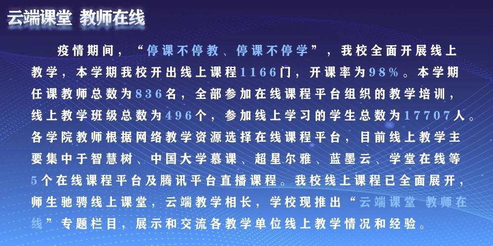 3月2日,我校开始本科线上教学工作,学校各学院按照学校线上教学工作安排,结合学院学科专业设置及教学特色,对线上教学工作进行总体部署和整体谋划,积极打造“一院一策、一课一案”,确保线上教学有序推进,严格落实“停课不停教、停课不停学”。