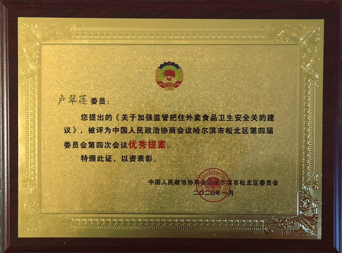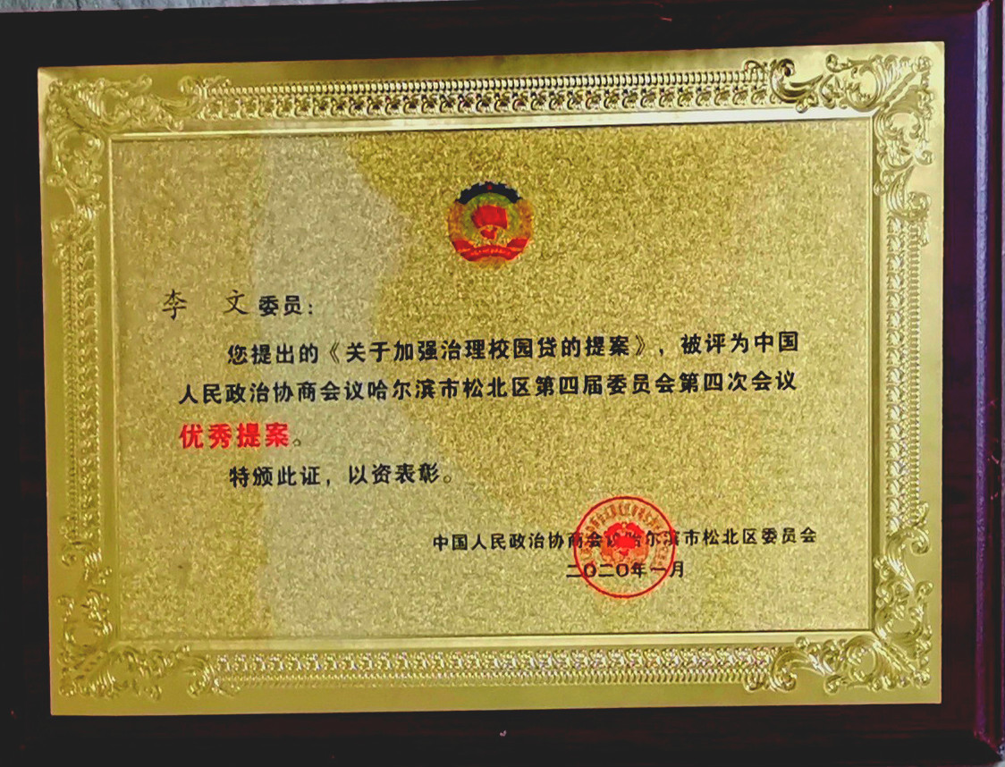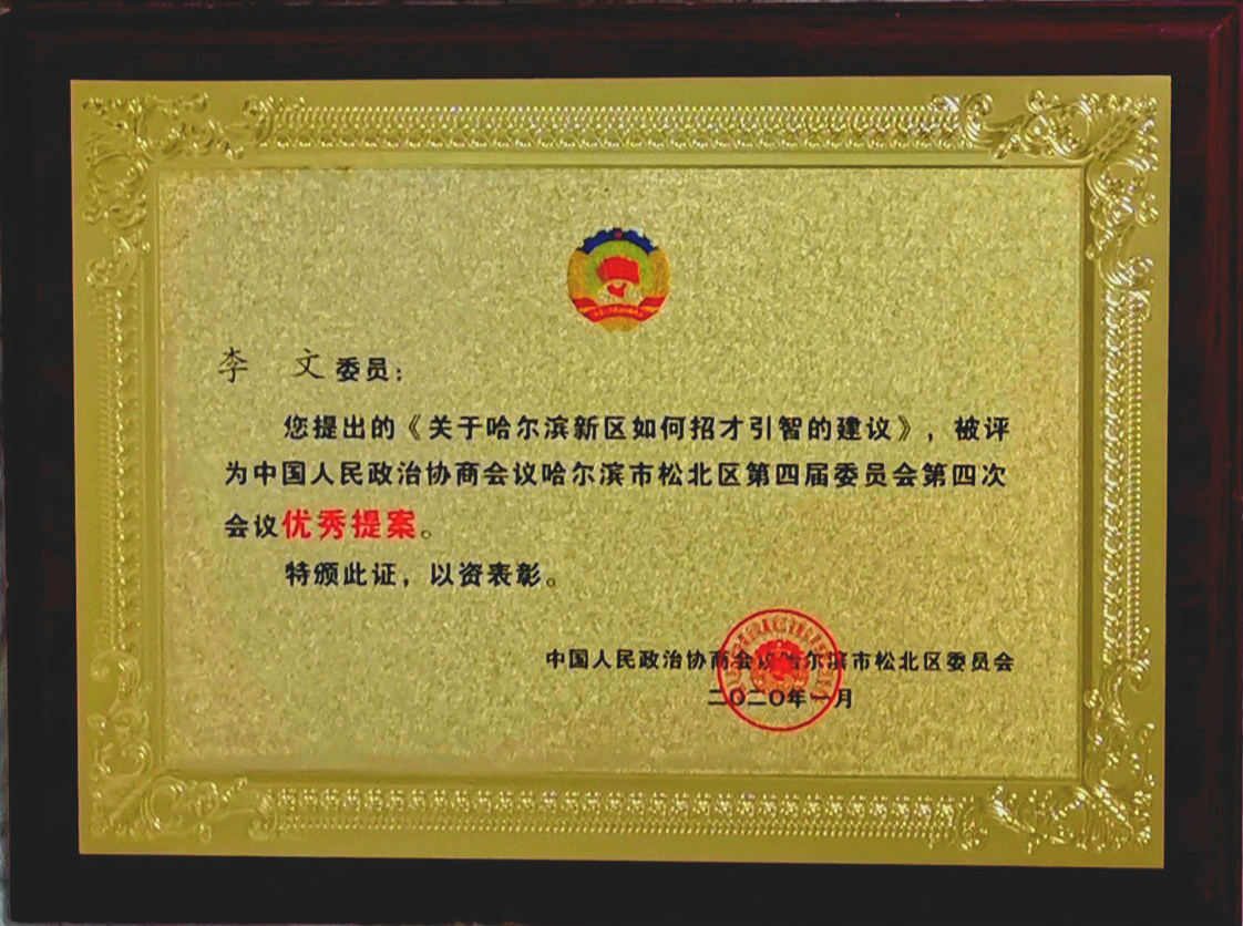 1月7至9日,松北区召开“两会”,人大代表张志军、侯雪筠和姜述弢,政协副主席项义军、景侠常委以及唐宝盛、卢翠莲、李文委员提交了“关于合理设计松北大道向滨水大道车辆行驶线的提案”“关于哈尔滨新区体系化多元化纠纷解决机制构建的建议”“关于推进黑龙江自由贸易试验区哈尔滨片区建设的建议”“关于哈尔滨新区建立数字化社区管理平台的建议”“加强师德师风建设,打造新区高素质教师队伍”“关于打通哈尔滨商业大学周边道路及对周边环境实施综合治理的建议”等16份内容丰富、涵盖广泛的议案提案。李文2项、景侠与卢翠莲分别1项提案在大会提案报告中受到表扬,并荣获“优秀提案”奖,李文在松北区政协会上作大会发言,并接受媒体采访。
