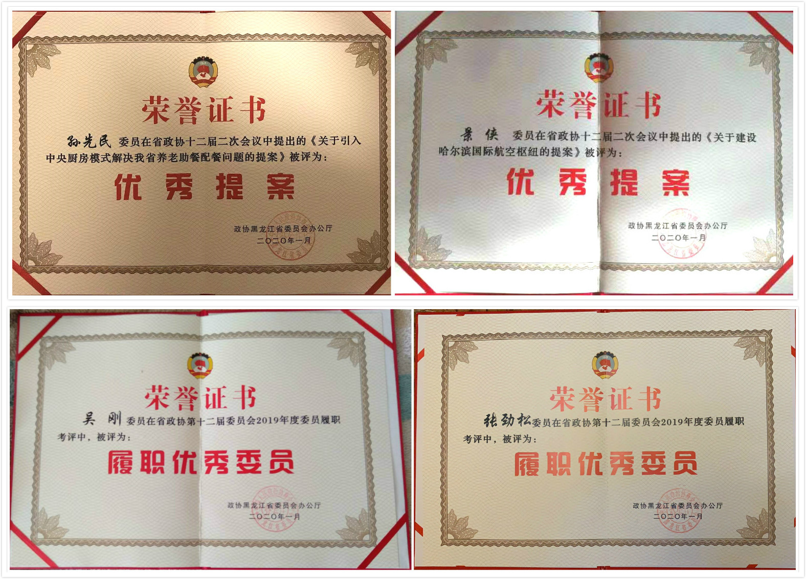 在省政协会议期间,景侠在大会上作了发言,孙先民在大会选举环节作为总监票人宣读选举结果。张劲松、吴刚委员荣获“优秀履职委员”称号,孙先民《关于引入中央厨房模式解决我省养老助餐配餐问题的提案》、景侠《关于建设哈尔滨国际航空枢纽的提案》分别荣获“优秀提案”。