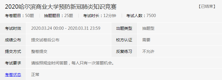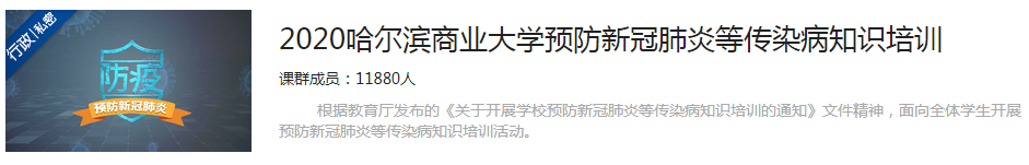 3月24日—5月31日,我校学生工作部易班发展中心面向全校学生开展了“2020哈尔滨商业大学预防新冠肺炎等传染病知识培训”活动,贯彻落实省教育厅《关于开展学校预防新冠肺炎等传染病知识培训的通知》文件精神,切实做好学校新冠肺炎疫情防控工作,让学生掌握新冠肺炎等传染病预防知识。此次活动主要采取组织学生在线学习观看教育培训视频和预防新冠肺炎知识竞赛等形式开展,共计吸引11880名学生参与。