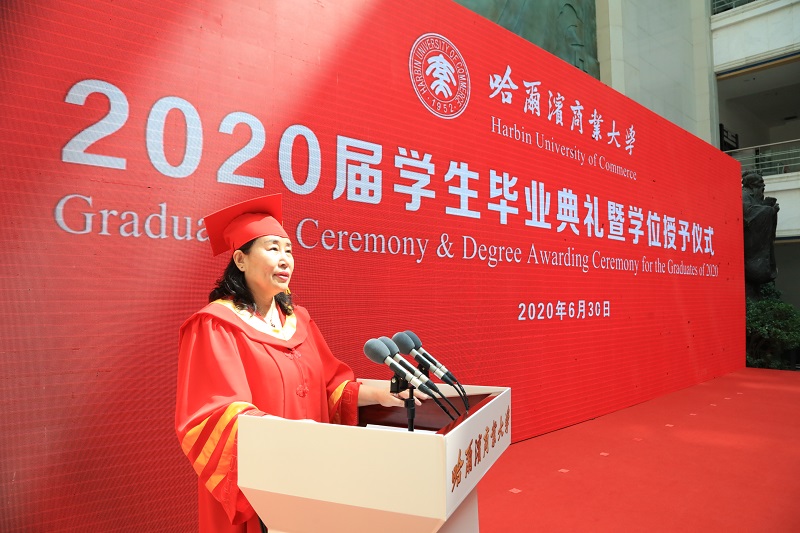 校学位评定委员会主席、校长郑秋鹛教授以《乘风破浪,御风前行》为题发表了热情洋溢的讲话。郑校长祝贺学校2020届5805名本科生,760名硕博研究生,以及来自18个国家的商务部援外硕士班56名留学生顺利毕业。郑校长与毕业生们一起回顾了四年的商大时光和发展变化,并为学生们的成长感到骄傲。她动情地说,你们用青春和激情,在商大68年的历史画卷中写下了浓墨重彩的一笔,铸就了商大历程,母校为你们而骄傲!