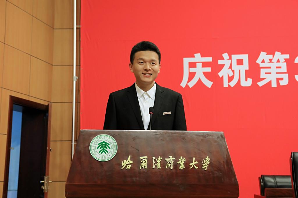 金融学院2018级金融学专业郭傲代表全体学生发言。郭傲向辛勤耕耘在各条战线上的老师们表示感谢并致以诚挚的节日祝福。郭傲表示,老师们的言传身教,给学生们做出了好榜样,作为学生,将以新青年的姿态勇担时代重任,用自己的行动证明青春的精彩,用热情与智慧和敬爱的老师们共同书写商大的辉煌,创造更加美好的明天。