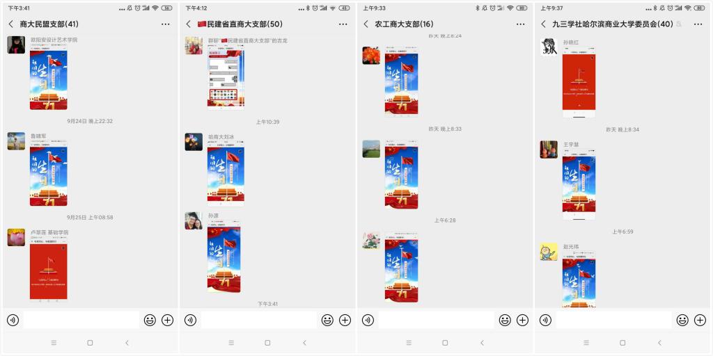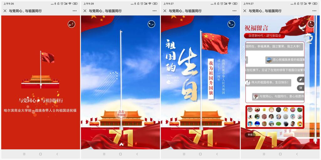 十一前夕,校党委在全校统一战线各界人士中开展了“与党同心、与祖国同行”升国旗、送祝福活动。宣传部新媒体工作室设计制作了“‘与党同心、与祖国同行’我为祖国升国旗送祝福”网络小程序,统战部依托基层党组织和民主党派基层组织,在民主党派成员、无党派知识分子、欧美同学会成员、归侨侨眷、少数民族教工中,开展了网上升国旗、送祝福活动。