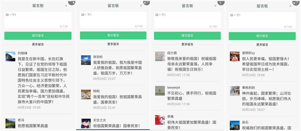 伴随着《我和我的祖国》深情优美的歌声,大家纷纷点击升旗按钮,为祖国升起国旗,并在留言区留言,抒发爱国情怀,歌颂祖国71年来的辉煌成就,将最美好的祝福送给伟大祖国。统一战线各界人士积极踊跃、全员参与,参加活动人数累计达到845人次,祝福祖国留言共计126条,形成了歌颂祖国祝福祖国的浓厚氛围。通过活动,统一战线各界人士进一步坚定了“四个自信”,增强了“五个认同”,并表示要与党同心、与祖国同行,为龙江经济建设和学校发展贡献力量。