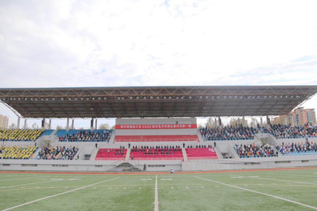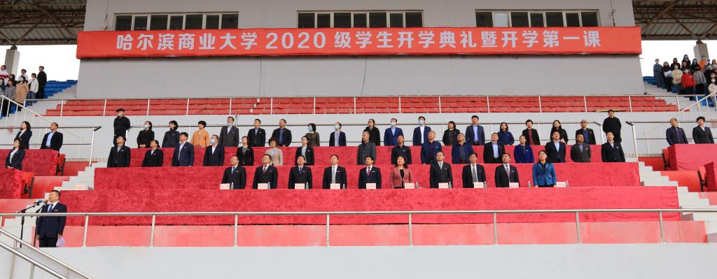 典礼伊始,国旗班迈着矫健整齐的步伐入场,全体起立奏唱国歌,伴随着着雄壮的《中华人民共和国国歌》,鲜艳的五星红旗冉冉升起。全场师生齐唱哈尔滨商业大学校歌《诚信歌》,在嘹亮高昂的歌声中,哈尔滨商业大学校旗飘扬在体育场上空。