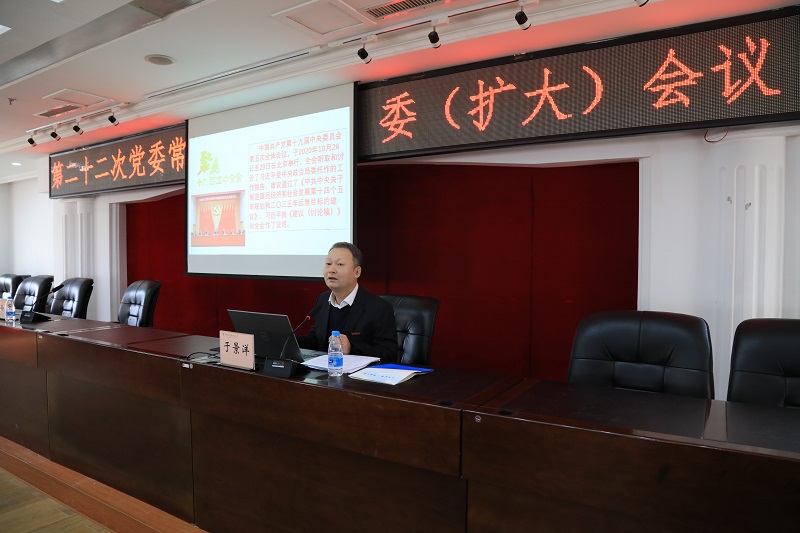 11月3日上午,学校召开党委常委(扩大)会议,传达学习党的十九届五中全会精神,马克思主义学院院长于景洋以《改革 开放 创新——党的十九届五中全会解读》为题作专题辅导。校领导、学校党委委员和各基层党委、党总支书记参加会议。校党委书记孙先民主持会议并就学习贯彻会议精神提出要求。