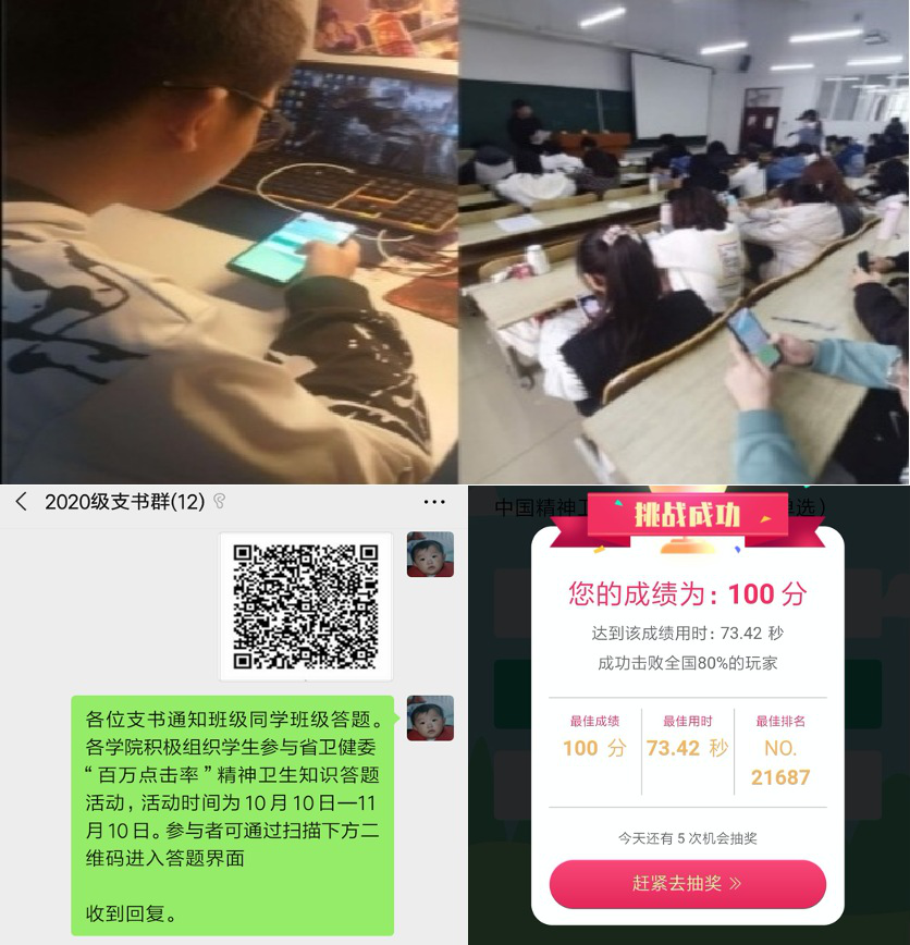 组织学生参与精神卫生知识答题活动。为帮助学生深刻理解精神卫生知识,提高学生对精神疾病的科学认识,营造和谐健康的良好学习生活环境,金融学院、财政与公共管理学院、能源与建筑工程学院等学院积极组织学生参与省卫健委“百万点击率”精神卫生知识答题活动。学生们认真答题,在答题过程中掌握了心理健康和精神卫生方面的常识,同时也学会了如何对自身以及身边同学的心理和精神状况做出有效判断。