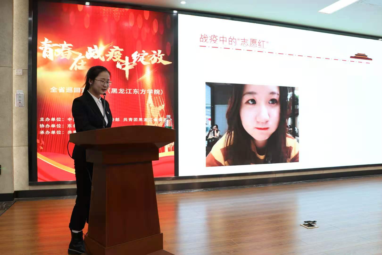 宣讲会上,于梦瑶生动地讲述了在绥芬河疫情严峻时期,她与双胞胎姐姐和绥芬河市青年志愿者突击队成员们团结协作,为守护国门、守护家乡而奋力抗疫的感人故事,展现了以于梦瑶同学为代表的我省青年在面对疫情时不怕苦、不畏难、不惧牺牲的伟大抗疫精神。