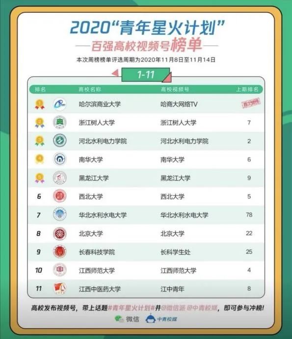 11月18日,2020“青年星火计划”百强高校视频号榜单揭榜,由我校网络电视台运营的“哈商大网络TV”视频号位列全国第一名,我校首次登榜即荣登榜首。
