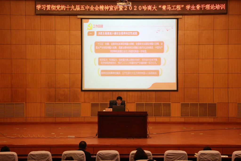为深入学习贯彻习近平新时代中国特色社会主义思想和党的十九大精神,持续兴起学习宣传贯彻党的十九届五中全会精神热潮,12月2日下午,学习贯彻党的十九届五中全会精神宣讲暨哈商大2020“青马工程”学生骨干理论培训讲座在我校国际报告厅举行,校党委书记孙先民以《学习贯彻党的十九届五中全会精神》为题,为学生骨干做全会精神宣讲。校团委全体人员,各学院团委负责人,校院两级“青马工程”学生骨干代表参加培训。校团委书记王鹤腾主持讲座。