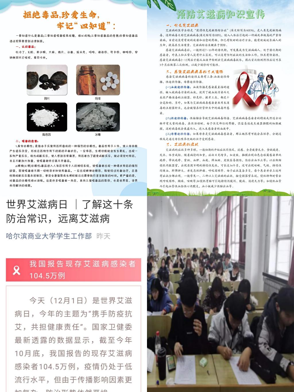 我校高度重视学生思想政治教育工作,学生工作部对学生群体特别是2020级新生制定宣传教育工作方案,开展全覆盖、立体化、多维度的校园宣传教育活动,积极主动、分层分类做好宣教工作。按照“以生为本、贴近实际、贴近需求、贴近学生”的工作原则,本着“思想引领、文化引导、情感引育”的工作思路,依托全媒体网络平台,构建宣传教育矩阵,通过发放预防艾滋病知识宣传单、禁毒宣传单和防范校园贷宣传单等线下宣传,并利用“哈尔滨商业大学学生工作部”微信公众号向全校学生推送文章让学生深入了解相关知识、提升防范意识等线上宣传活动,从而达到宣传教育常态化的目的。