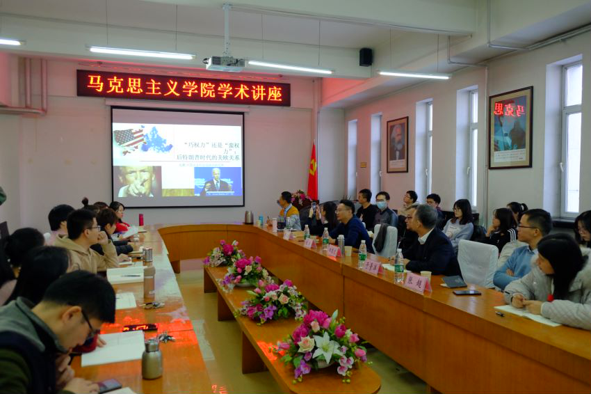 为进一步深入学习党的十九届五中全会精神,深刻认识错综复杂的国际环境带来的新矛盾新挑战,明晰我国社会发展所处环境,12月6日,马克思主义学院邀请中国社会科学院欧洲研究所副所长田德文、研究员赵晨两位国际问题专家作专题讲座,马克思主义学院教师和全体研究生参加讲座。马克思主义学院副院长郑秋月主持讲座。