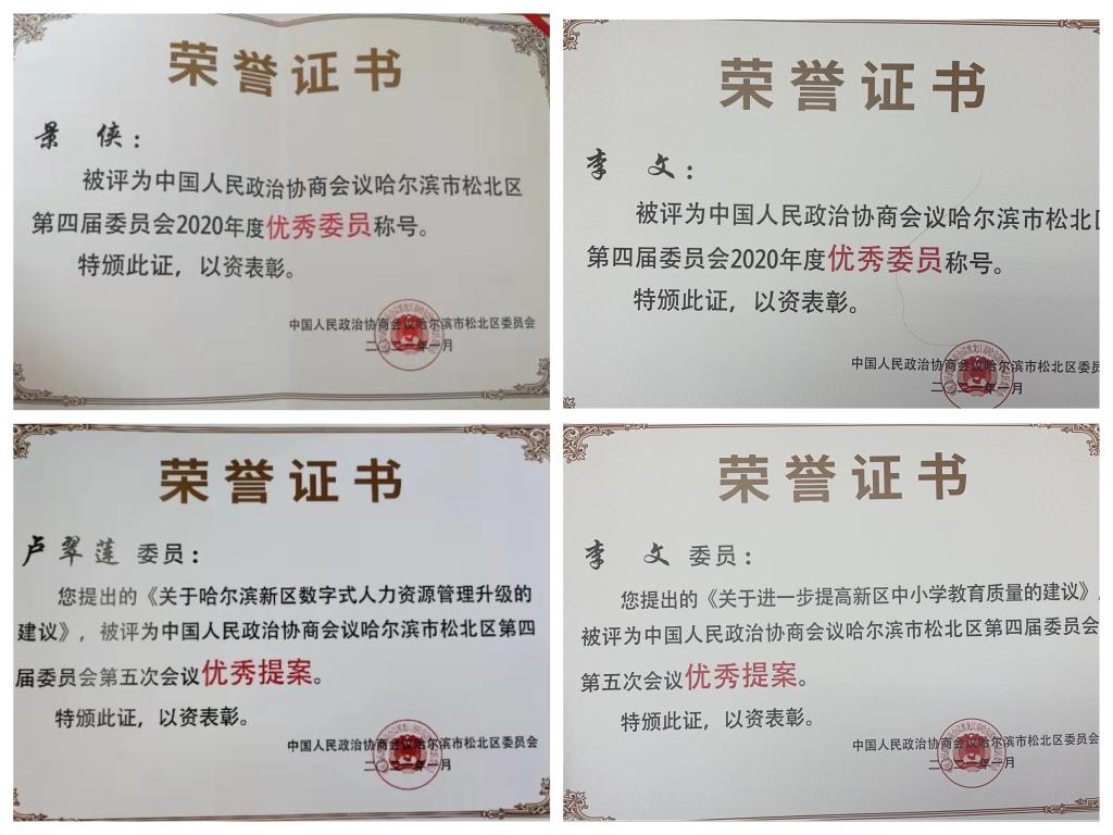 2021年3月3至4日,松北区“两会”期间,人大代表张志军、侯雪筠,政协常委景侠,委员卢翠莲、李文提交了“城市基础设施建设前应实施会签制度”“完善创新创业机制,助推松北新区高质量发展”“把松北区打造成绿色宜居海绵城市的建议”“关于在学海街早市建立垃圾转运房的建议”“关于制订哈尔滨新区总体建设规划的建议”“推进政产学研深度融合,让科技成果在新区落地生根”“关于打通学海街及对周边环境实施综合治理的建议”等7份切中实际、措施可行的议案提案。景侠、李文被评为政协松北区第四届委员会2020年度“优秀委员”,卢翠莲“关于哈尔滨新区数字式人力资源管理升级的建议”、李文“关于进一步提高新区中小学教育质量的建议”获松北区政协四届五次会议“优秀提案”。
