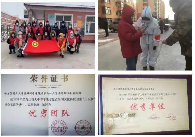 深学细照笃行,担当实干争先。在知识学习、情感激发、理论深化基础上,全校师生积极投身“脱贫攻坚”“乡村振兴”等国家战略,结合自身专业特长开展多种形式社会实践与志愿服务,主动围绕经济社会发展重大需求强化创新创业,奔赴到祖国和人民最需要的地方去建功立业。校院两级团组织采取“互联网+社会实践”的形式,将“三下乡”与“返家乡”社会实践结合,通过助力疫情防控和复工复产、投身打赢脱贫攻坚战、参与乡村振兴战略实施及“红色足迹寻访”、“健康扶贫青春行”大健康调研等重点和专项活动,引导广大青年学生在社会实践中受教育、长才干、作贡献,共有7个集体和个人荣获2020年暑期“三下乡”社会实践活动国家级、省级奖项。寒假期间,各级团组织持续开展“青春暖流•情暖留守儿童”线上远程关爱帮扶齐齐哈尔市依安县留守儿童活动。自疫情发生以来,在学校党委的坚强领导下,全校师生以“疫”为令,把疫情防控作为践初心担使命、弘扬爱国奋斗精神的主战场,100余名教师党员先锋突击队员、1800余名青年学生志愿者投身到疫情防控志愿服务工作中。2021年寒假,共有800余名青年学生志愿者坚守在疫情防控工作一线。学校驻依安县新发乡福来村、新屯乡太民村的驻村干部们坚守岗位、连续作战,在巩固拓展脱贫攻坚成果同乡村振兴有效衔接和疫情防控等各项工作中献智献力。依托龙江“红绿蓝金银”五色教育资源,学校大学生法律援助中心 、友爱社工协会、青年志愿者服务中心、大学生科技协会等学生组织和学生社团,持续开展一系列有情怀、有温度、有色彩的社会实践活动,产生积极社会影响。2020年度,全校共有96名大学生应征入伍,19名毕业生参加大学生志愿服务西部计划、兴边富民研究生支教团、大学生志愿者服务基层行动计划,扎根基层奉献基层,用青春书写精彩人生。