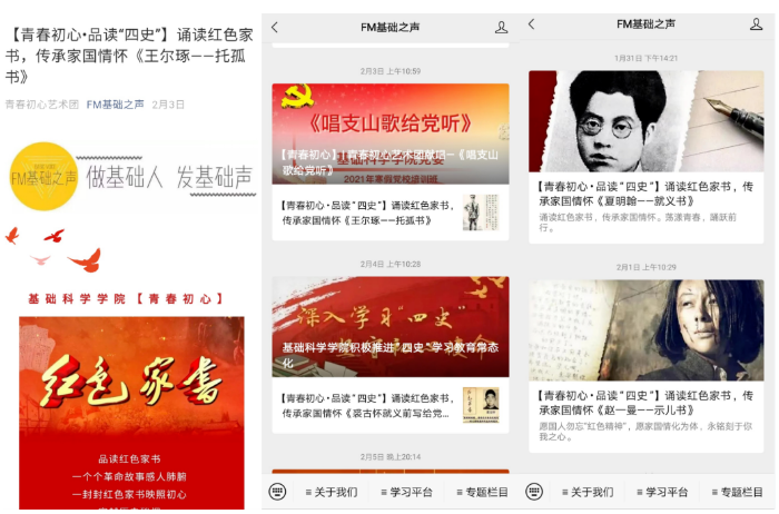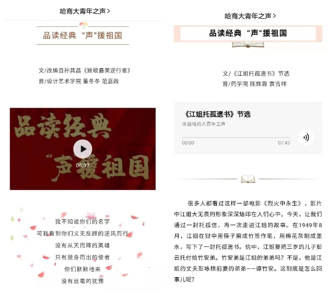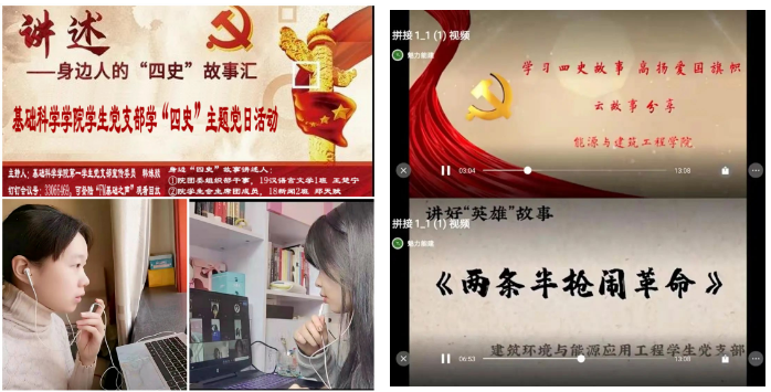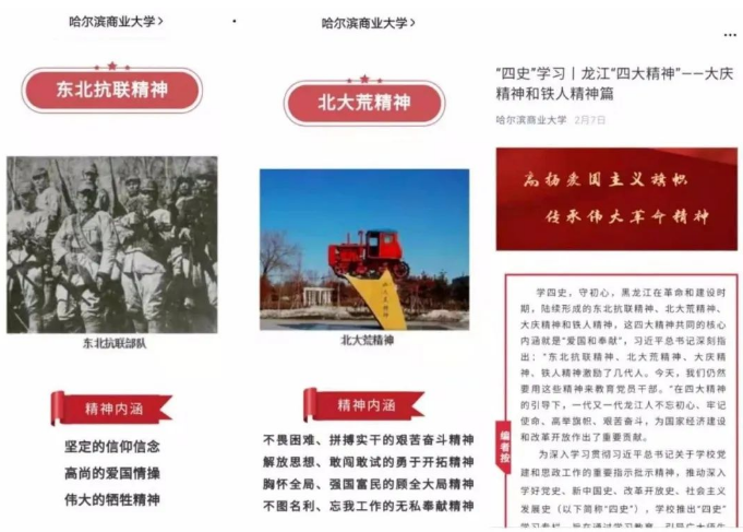 聚焦“云创作”,增添学习教育“云热度”。以“网上重走长征路”为切入点,围绕“高扬爱国主义旗帜 传承伟大革命精神”主题,继续通过“英雄”“复兴”“创新”“信念”四个关键词开展“四史”学习教育,运用互联网技术和信息化手段,引领师生积极创作优秀网络文化作品,推进“四史”学习教育接地气、聚人气。学校各级党组织将“四史”学习教育融入日常思想政治教育,在扎实完成“规定动作”的同时,创新做好“自选动作”,着力通过“看、听、学、悟、行”全维度为师生量身定制“四史”学习教育寒假“线上版”。学校党委组织各基层党委、党总支开展“云”红歌传唱活动,录制《唱支山歌给党听》《我和我的祖国》《在灿烂阳光下》等多首红色经典歌曲;组织开展“云上行走”活动,通过“云”游爱国主义教育基地、观看红色影片、讲述家乡发展变化等形式,回眸难忘瞬间,感悟红色精神,传承红色基因。各单位陆续开展“四史学习教育•微领学”“龙江四大精神、龙江高校博物馆线上研学巡展”线上主题党日团日、党课团课及班会活动,以“四史”学习教育涵养初心使命、厚植家国情怀。管理学院党委组织教工党支部开展“云”参观、“云”分享活动,线上参观中国共产党第一次全国代表大会会址纪念馆。基础科学学院党委“青春初心艺术团”开展“读红色家书•传承百年信仰”网络诵读会,线上推送夏明翰“就义书”、赵一曼“示儿书”、王尔琢“托孤书”等20余篇红色家书。财政与公共管理学院党委举办“感悟‘四史’”优秀作品线上评选展示活动,陆续推出软笔书“四史”、硬笔展情怀、板报绘历史、诗歌颂辉煌、说书永流传等文化作品。能源与建筑工程学院党委组织各专业学生党支部举办“重走长征路‘云’上故事会”,制作微视频讲述《理想与信念》《两条半枪闹革命》《焦裕禄》《中国高铁崛起的发展历程》等红色故事、改革故事、创新故事、奋斗故事。法学院党委创新开展“法苑昕声‘四史’特辑”“漫画‘四史’”活动,激励师生同说“四史”、共画“四史”。英才学院党委结合《中国共产党简史》《党风十章》等书目,开展党史学习读书分享活动。
