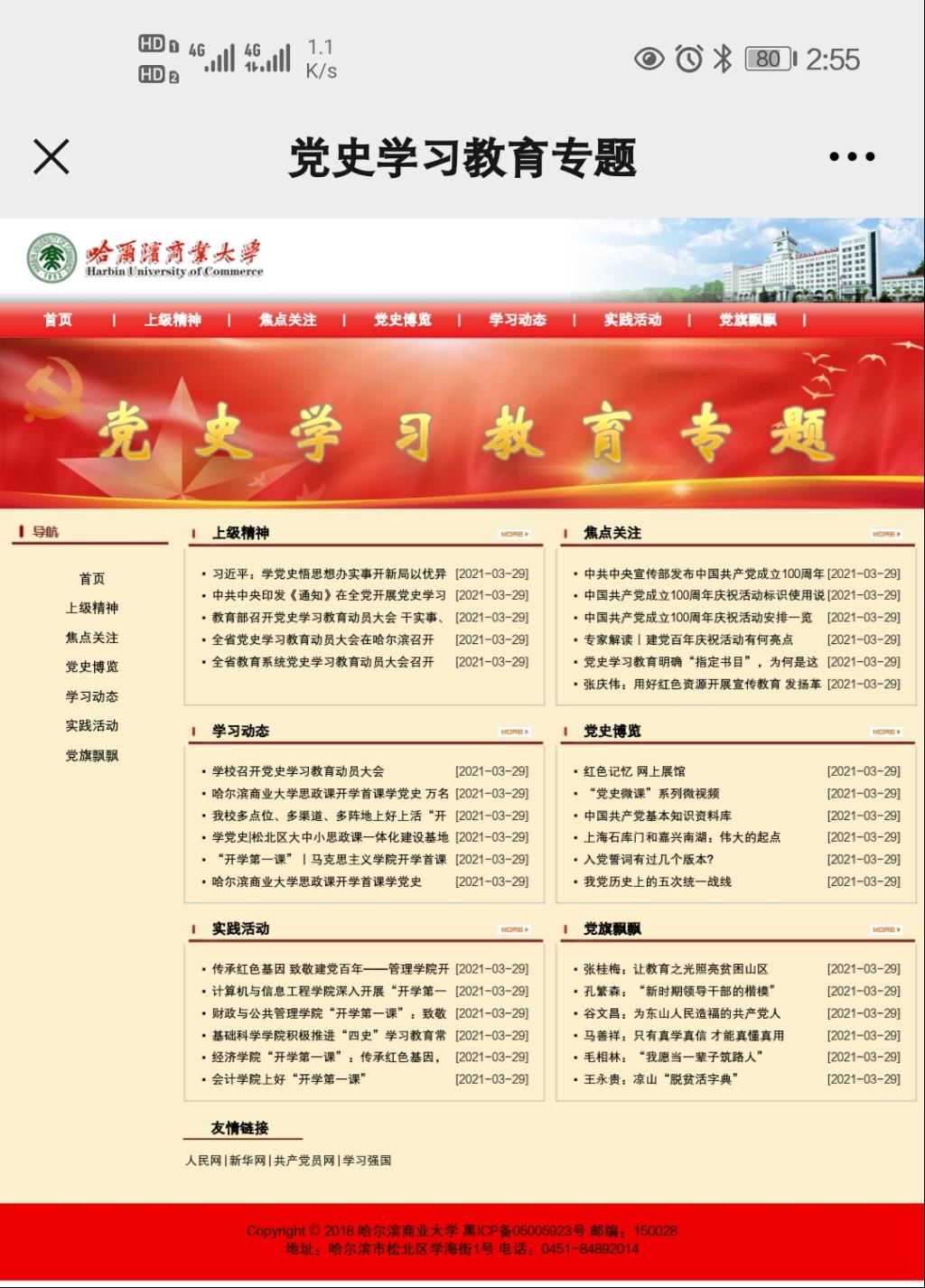 专题网站下设“上级精神”“焦点关注”“党史博览”“学习动态”“实践活动”“党旗飘飘”6个栏目,通过整合网络教育资源,着力为全校师生打造随时、随地、随身学习的移动平台,大力宣传党史学习教育的重大意义和党中央决策部署,总结报道学校党史学习教育进展情况、典型经验和特色亮点,发挥校园融媒矩阵优势,构建纵向贯通、横向融合的网格式学习宣传平台,营造学史、知史、明史的浓厚氛围,确保党史学习教育有力有序推进,切实把学习教育成效转化为推动学校事业高质量发展的强大动力。
