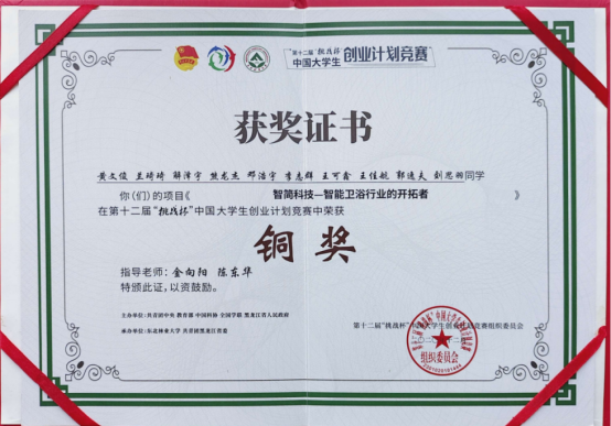 第十二届“挑战杯”中国大学生创业计划竞赛由团中央、教育部、中国科协、全国学联、黑龙江省人民政府联合主办,东北林业大学、共青团黑龙江省委承办。本届大赛全程采用线上的形式举办,超过600万人次在线参与8项活动和竞赛角逐,我校两项作品“智简科技——智能卫浴行业的开拓者”和“‘曲颈向天歌’中国·依安鹅产品营销发展计划”获得全国铜奖。
