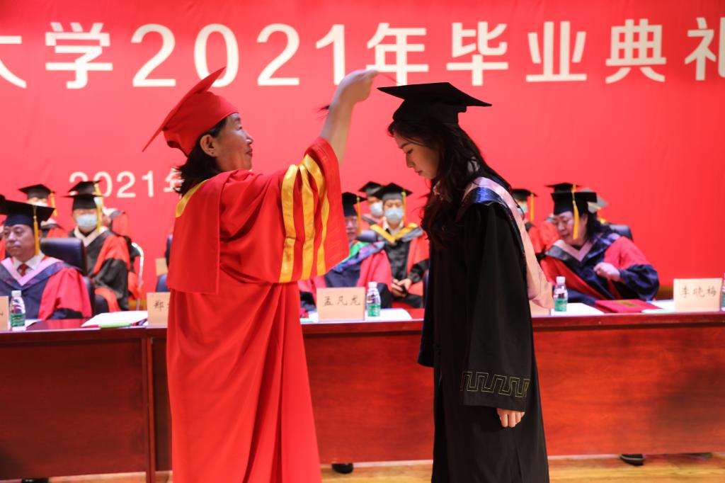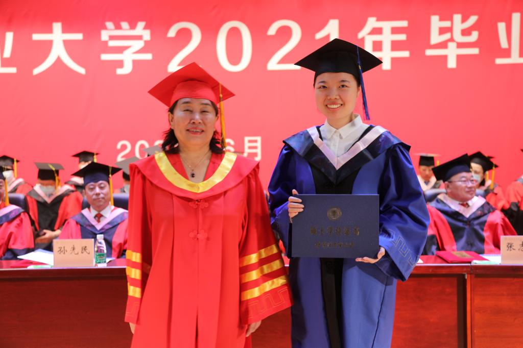 郑秋鹛校长以《立大志、明大德、成大才、担大任》为题发表了热情洋溢的讲话。郑秋鹛祝贺学校2021届6038名本科生,812名硕博研究生,以及56名留学生顺利毕业。郑校长与毕业生们一起回顾了四年来学校所取得的成绩,并为学生们的成长感到骄傲。她动情地说,你们用奋斗和激情,谱写了壮丽的青春之歌,学校的课堂里、操场上、舞台上,都见证过你们青春活力的最美绽放,这一切都将成为你们一生珍贵的回忆。郑校长寄语毕业生,要做一个有梦想、有计划的人,“人可以平凡,但不可以平庸”,平凡是努力过后的坦然,平庸是随意过后的必然,想抵达终点,必须要有计划的不断前进,视野才能不断开拓,最终成就辉煌的人生。要做一个有耐力、有毅力的人,万事都不是一蹴而就的,人人都会在人生之路上遇到曲折坎坷,遇事淡定,靠耐力和毅力去翻越障碍,是人生的必修课,不要被外部所扰、不要为世风所魅、不要为利欲所动,明德修身,立德铸魂,不忘初心,继续前行。做一个有创新思维、有创业能力的人,创新是发展的动力和源泉,要把不可能变成可能,把不完善变成完善,不断提升创新创业能力,成就非凡的自己。郑校长嘱托同学们要永远坚定振兴国家的理想信念,不负韶华,奔赴下一场山海,以奋斗之我赴未来之约!