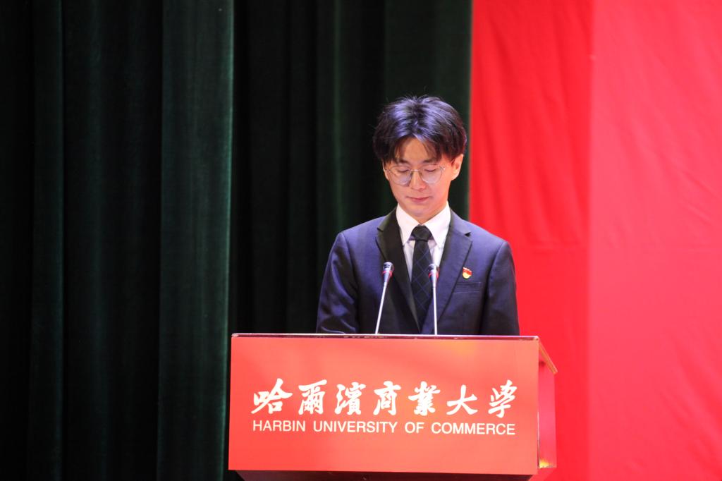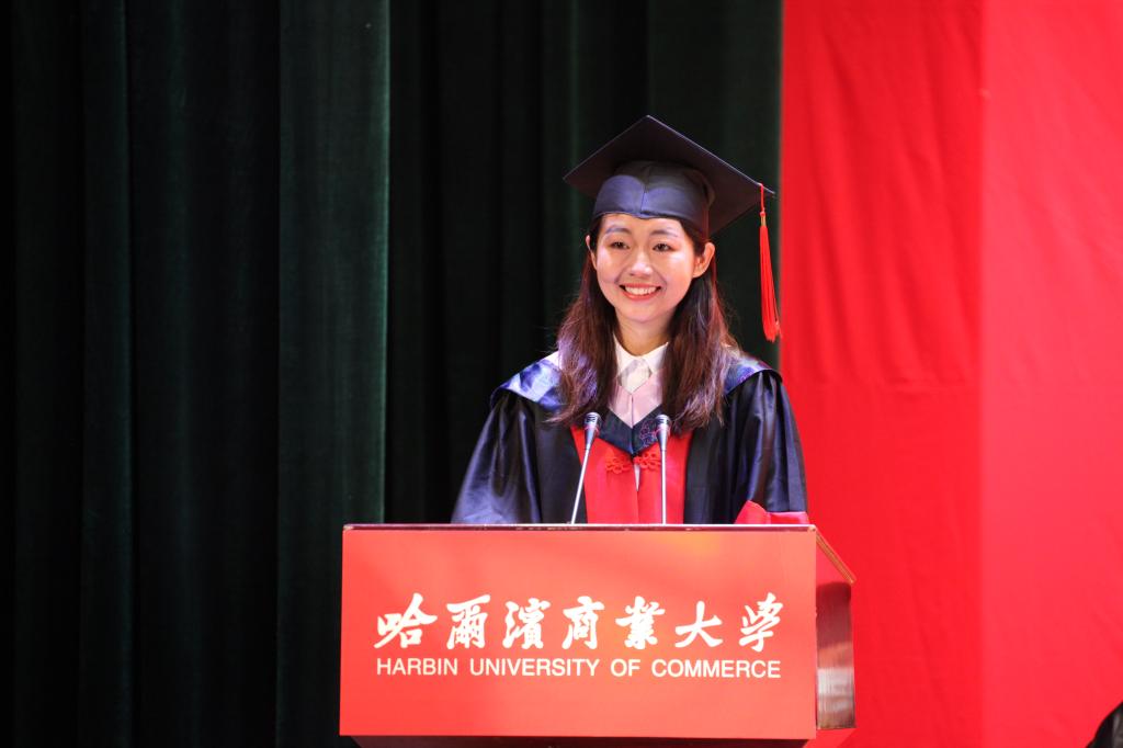在校生代表、轻工学院2018级印刷工程专业学生王一恒代表全体在校生向即将离开母校的学长学姐们表达最衷心的祝愿,祝愿他们抱诚守真、言信行果,勇往直前去追求人生的理想,心怀商大、感恩母校,无畏艰难去探求生活的真善,无怨无悔、一无反顾,用坚韧的品质诠释无悔的青春,在人生的舞台上抒写出最华美的礼赞。