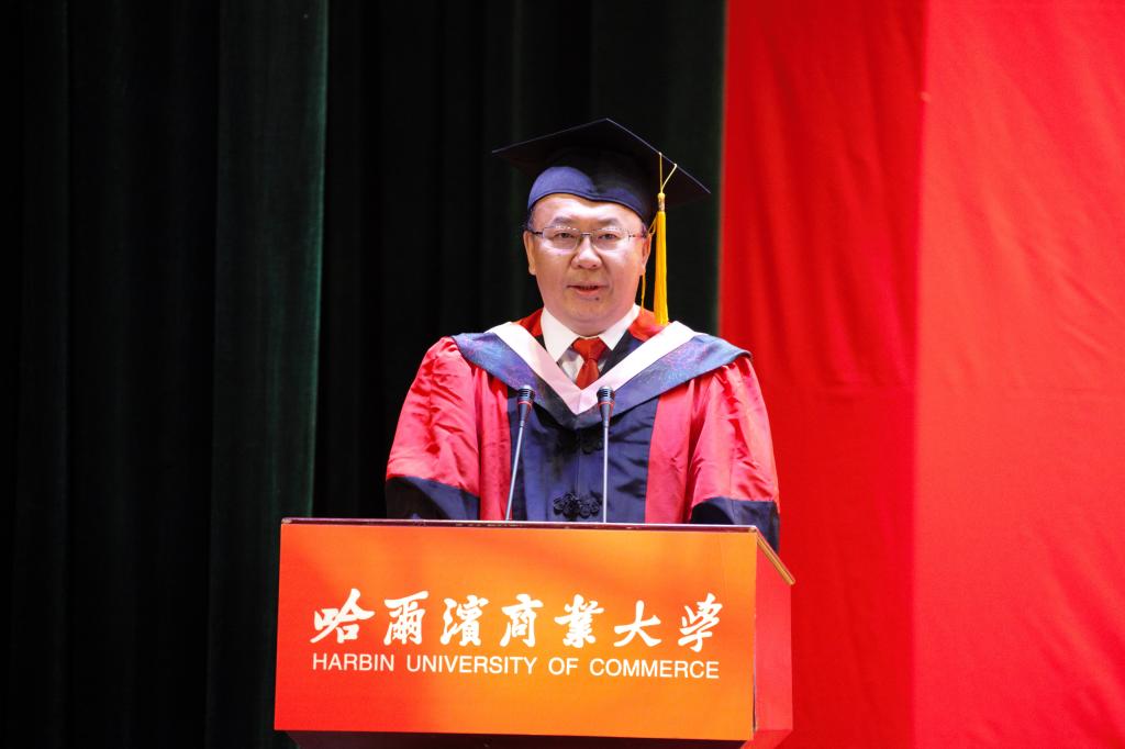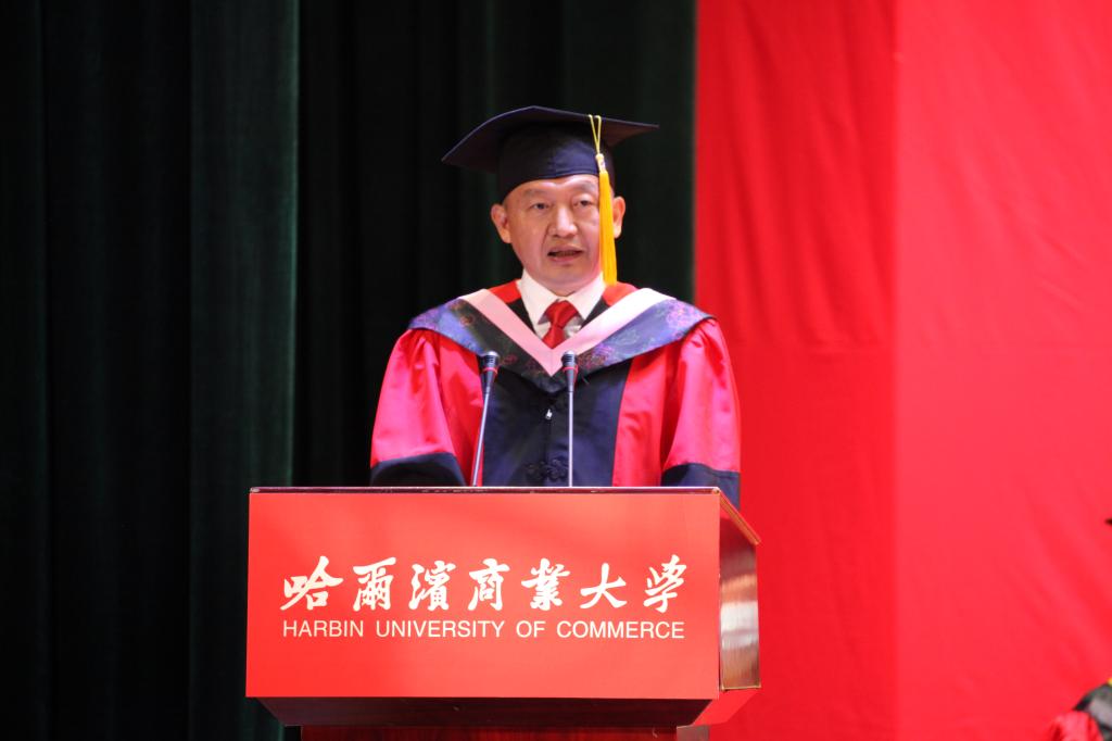 校友代表、我校83级商业建筑专业毕业生、哈尔滨金都新城投资建设发展有限公司董事长张洪武发言。张洪武与大家分享了个人成长的经验和体会。他寄语毕业生,“要志存高远,脚踏实地,立志与实干是相辅相成的,要把立志作为前提,把勤勉作为保障。心怀感恩,回馈社会,要有‘穷则独善其身,达则兼济天下’的抱负,也要有‘饮水思源,不忘桑梓’的情怀,把感恩作为实现个人社会价值的重要途径,积极地回馈社会、服务人民”。