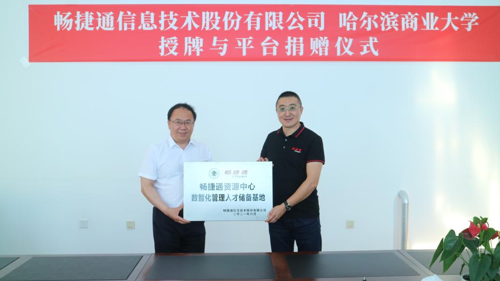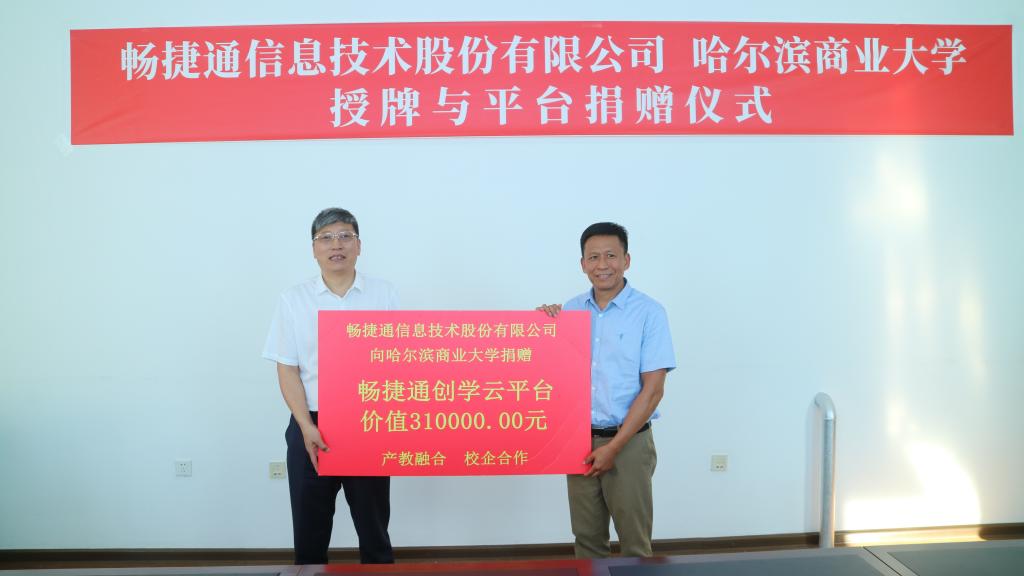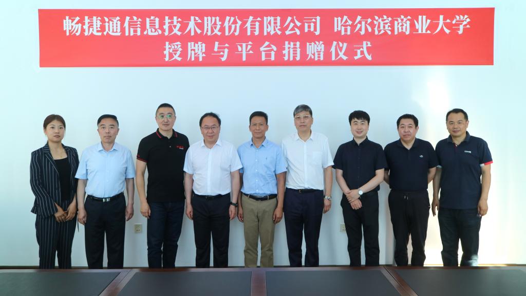 6月22日下午,哈尔滨商业大学与畅捷通信息技术股份有限公司举行校企合作授牌与平台捐赠仪式。畅捷通资源中心总经理马岳峰、培训教育部产教融合总监谭兆成、培训教育部华北东北区域总监刘明、黑龙江知为教育科技有限公司总经理董春辉,我校副校长张林,职业技术教育学院院长刘兴革、职教学院继教学院MBA(MPA)中心党委副书记丁连明、职业技术教育学院副院长周云峰、职业技术教育学院副处级辅导员乔祖强参加授牌与平台捐赠仪式。