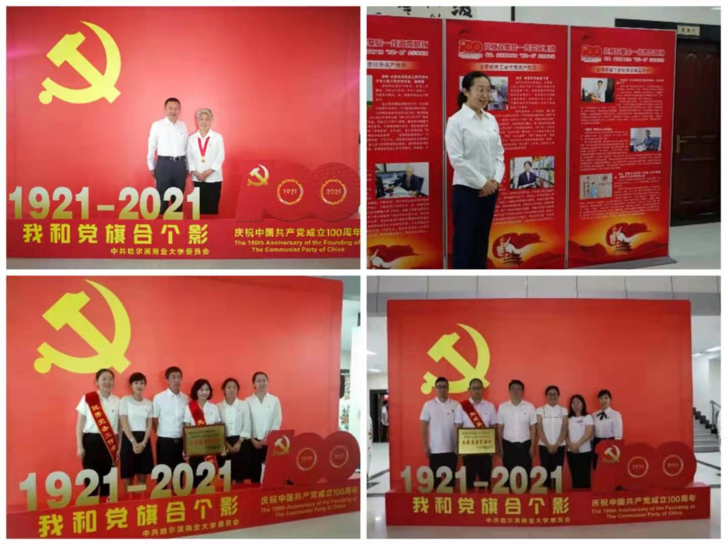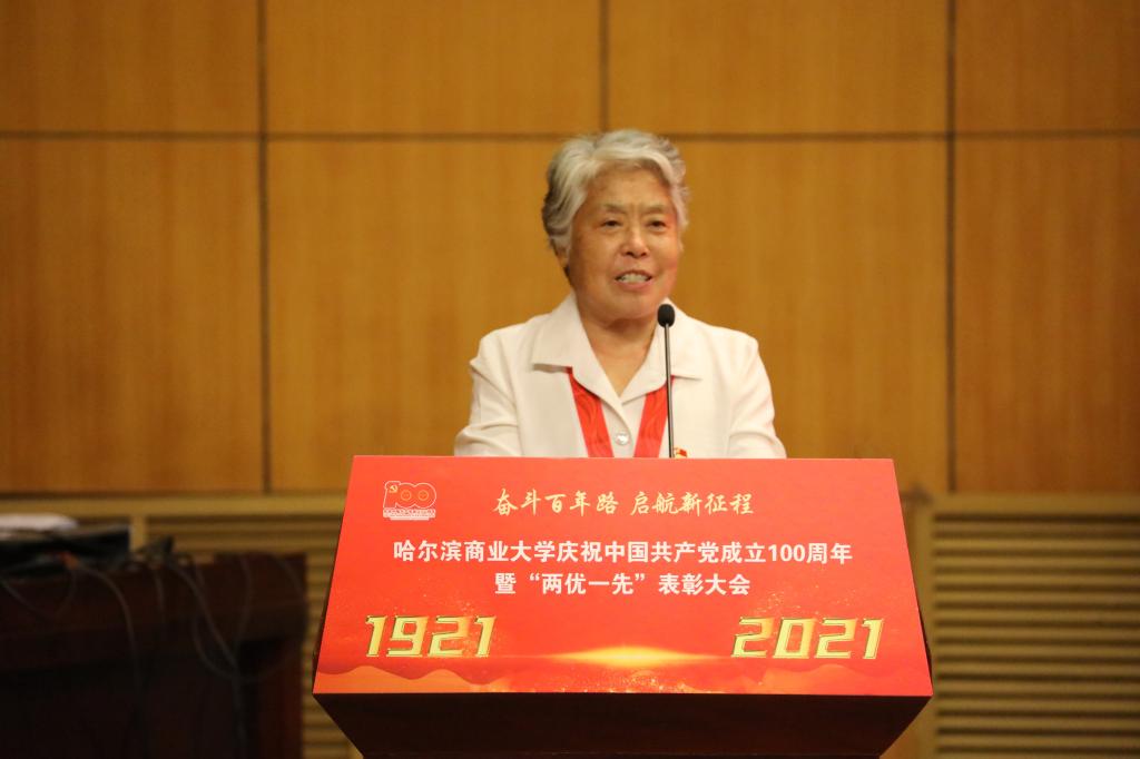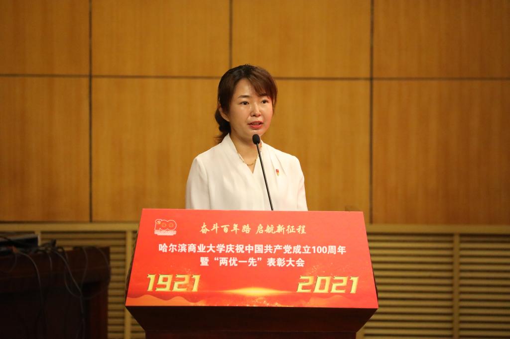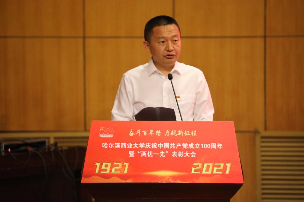 纪委书记孟凡龙宣读省委、省委教育工委“两优一先”表彰名单和《关于表彰2020—2021年度哈尔滨商业大学优秀共产党员、优秀党务工作者和先进基层党组织的决定》。副校长张林为获得优秀共产党员学生代表、副校长姜国峰为获得优秀共产党员教师代表、副校长张志军为获得优秀党务工作者代表、副校长于树彬为获得先进基层党组织代表颁发“两优一先”荣誉证书及奖牌。