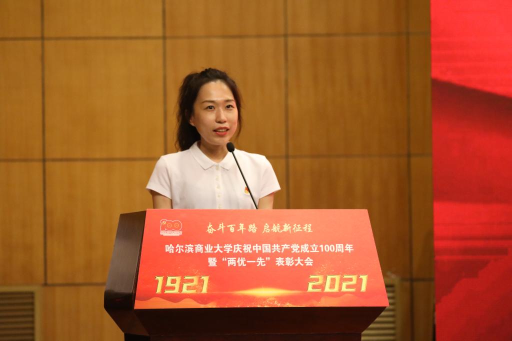 优秀共产党员教师代表、食品工程学院教师张娜表示,作为一名共产党员,将坚持学习,修身治学,继续认真学习好党的创新理论,不断提升自身能力素质,把学习成果转化为运用科学理论、科学知识分析和解决实际问题的能力,转化为培养学生的具体实践。坚持努力,恪尽职守,立足岗位,主动作为,勇于开拓创新,努力将担子担起来,将责任扛起来,在工作中履职尽责、担当作为,继续带领科研团队扎根黑土地,让研究成果在广袤富饶的土地上开花结果,枝繁叶茂。坚持奉献,搭建平台,为学生搭建展示学识、技能和才华的平台,帮助学生自信而扎实的走好通往未来的星光大道,把舞台呈现给每一位锐意进取的商大人。