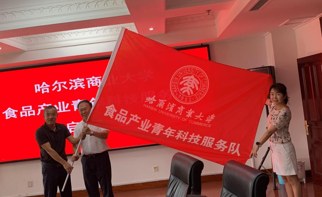 张林为哈尔滨商业大学食品产业青年科技服务队授旗。