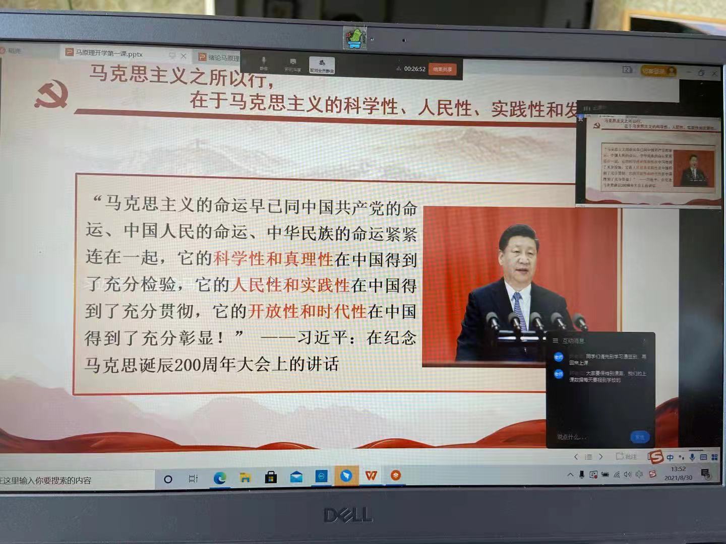 为深入学习贯彻习近平总书记在庆祝中国共产党成立100周年大会上的重要讲话精神,学校党委充分发挥思政课主渠道作用,把习近平总书记“七一”重要讲话精神作为“开学第一课”核心内容,扎实推动党的理论创新最新成果进教材进课堂进头脑。新学期伊始,马克思主义基本原理概论课、毛泽东思想和中国特色社会主义理论体系概论课率先开讲,思政课教师与全校大二、大三年级学生齐聚线上,打造“红色”思政课堂,广泛掀起学习热潮,全力将学习贯彻习近平总书记“七一”重要讲话精神不断引向深入。