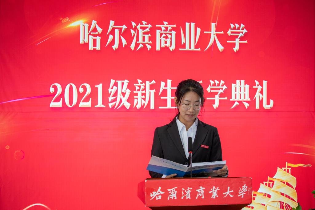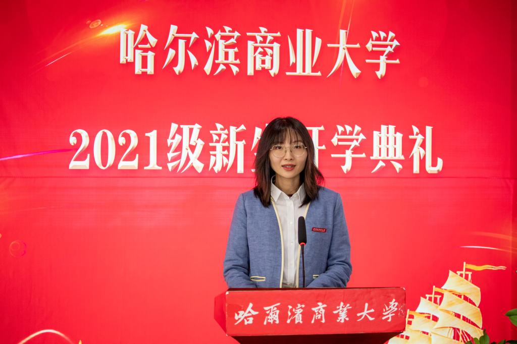 教师代表、管理学院教师袭希博士代表全校教职工发言。袭希勉励新同学们要始终记得点亮自己的灯塔,不要忘记自己来到这里做什么,又是什么使自己坚持至今,尽管前路漫漫,航灯迷烁,相信一步步走来的你们,将不断修正航线,生活注定不会溶化你们的激情、理想、决心和追求。俯视皆为拳拳初心,仰望一片殷殷前程,接下来的日子,在冰城,在哈尔滨商业大学,希望你们有大兴安岭山脉一样坚实的学识基础和坚韧的意志品质,有松花江一样灵动的品性和开放包容的气度,大步向前,去努力,去拼搏,去踏遍荆棘,也去越过高山,华章有你们,盛世有你们,强国有你们。