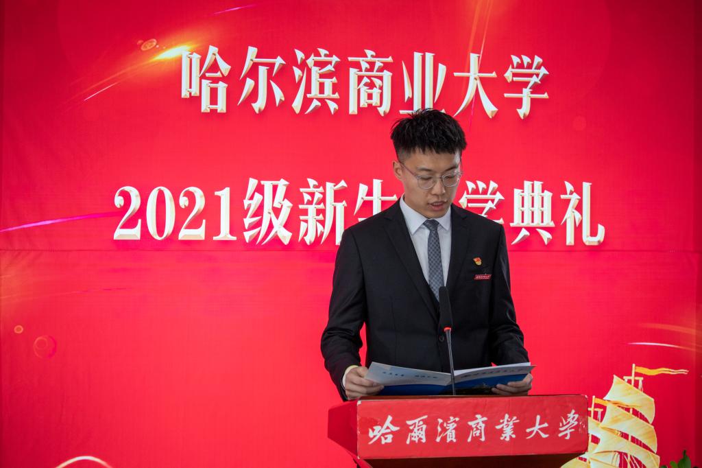 新生代表、英才学院工商管理类1班郑秋阳发言。郑秋阳说,大学作为人生的新起点,迈好第一步是关键,要找到人生目标,树立正确的人生观和价值观,珍惜时间、牢记使命,脚踏实地、勤于思索,学会担当、懂得感恩,刻苦学习、博览群书,不断完善知识结构,提高专业素质与综合能力,努力成为一名德智体美劳全面发展的高素质人才,要恪守“求真至善 修德允能”的校训,用“天生我材必有用”的信心,用“吹尽黄沙始到金”的毅力,用“直挂云帆济沧海”的勇气,去迎接大学的洗礼,努力在商大,拼搏在商大,做敢于有梦、勇于追梦、勤于圆梦的商大新青年。