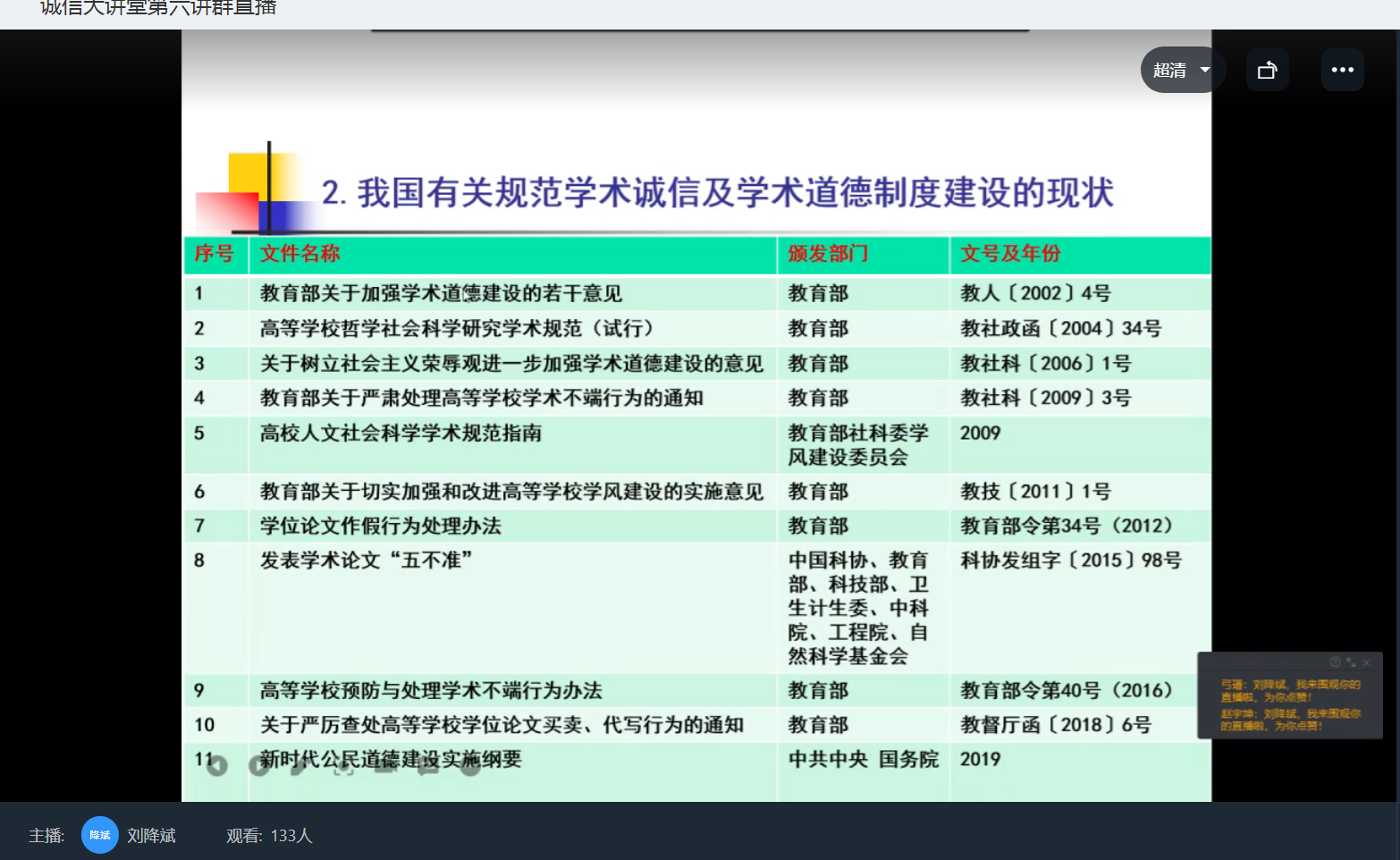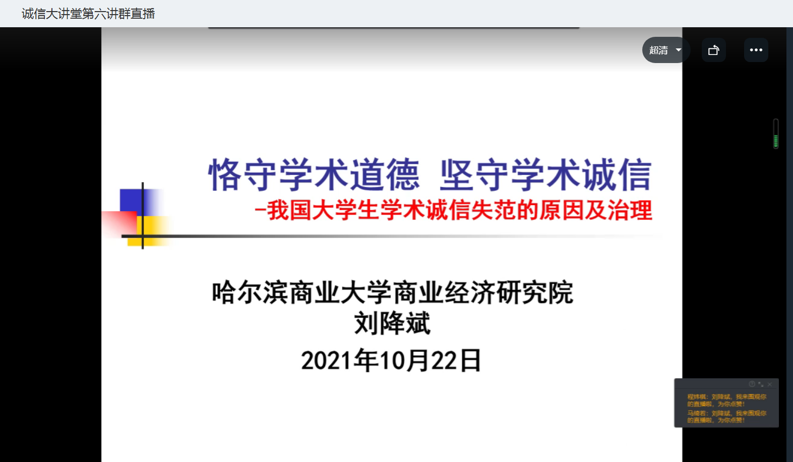 刘降斌教授讲座内容丰富,观点鲜明,逻辑严密,解读深刻,使广大同学深受教育和启发。他们纷纷表示,要严守学术道德底线,抵制学术不端行为,忠于真理、探求真知,自觉倡导诚信风尚,争做新时代诚实守信的有为青年。