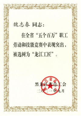 魏志春荣获“龙江工匠”荣誉称号