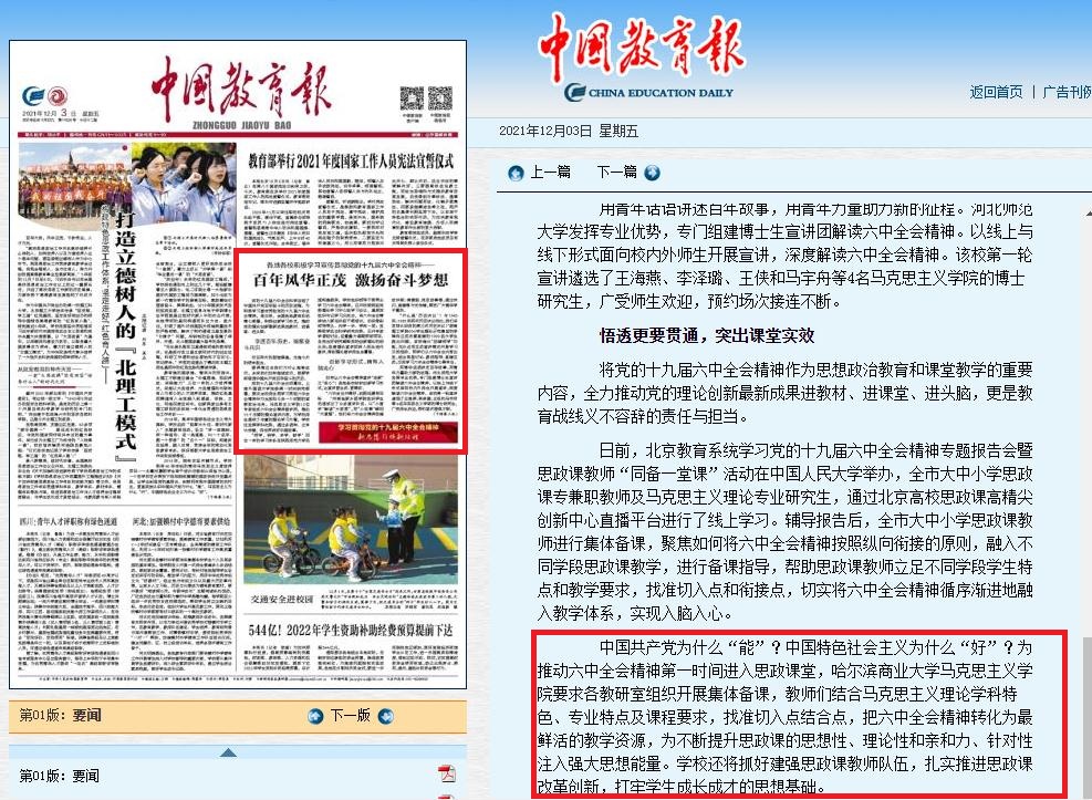 近日,为深入学习宣传贯彻党的十九届六中全会精神,引导全校师生把思想和行动统一到全会精神上来,学校党委把学习贯彻全会精神作为思想政治教育和课堂教学的重要内容,全力推动党的理论创新最新成果进教材、进课堂、进头脑,奋力答好为党育人、为国育才时代考卷。学校党委在强化思想政治理论课的主渠道作用上下功夫,组织思政课教师面向授课班级,集中开展全会精神专题辅导,全方位、多层次、多视角宣传解读全会精神,形成声势、形成热潮,形成全校万名学生同上学习全会精神“思政大课”的生动局面,教育引领青年学生从党的百年奋斗历程中汲取奋进新征程的智慧和力量。