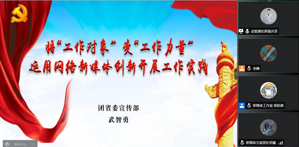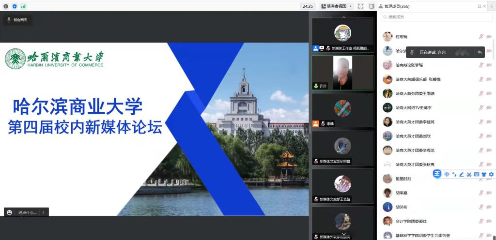 为了加强学校新媒体建设,推进融媒深度发展,提升校园网络文化品位,不断增强新媒体平台的引导力、传播力和影响力,学校于12月11日上午通过视频会议方式举办了第四届校内新媒体论坛。 黑龙江广播电视台极光新闻事业部副主任张晓光、团省委宣传部新媒体中心负责人武智勇,校党委宣传部副部长许蕾、党委宣传部李巍,校院两级新媒体平台指导教师代表出席论坛;学校各级媒体学生负责人共270余人参加论坛。本次论坛包括主题报告和分论坛主题发言两个单元,分别由许蕾、李巍主持。